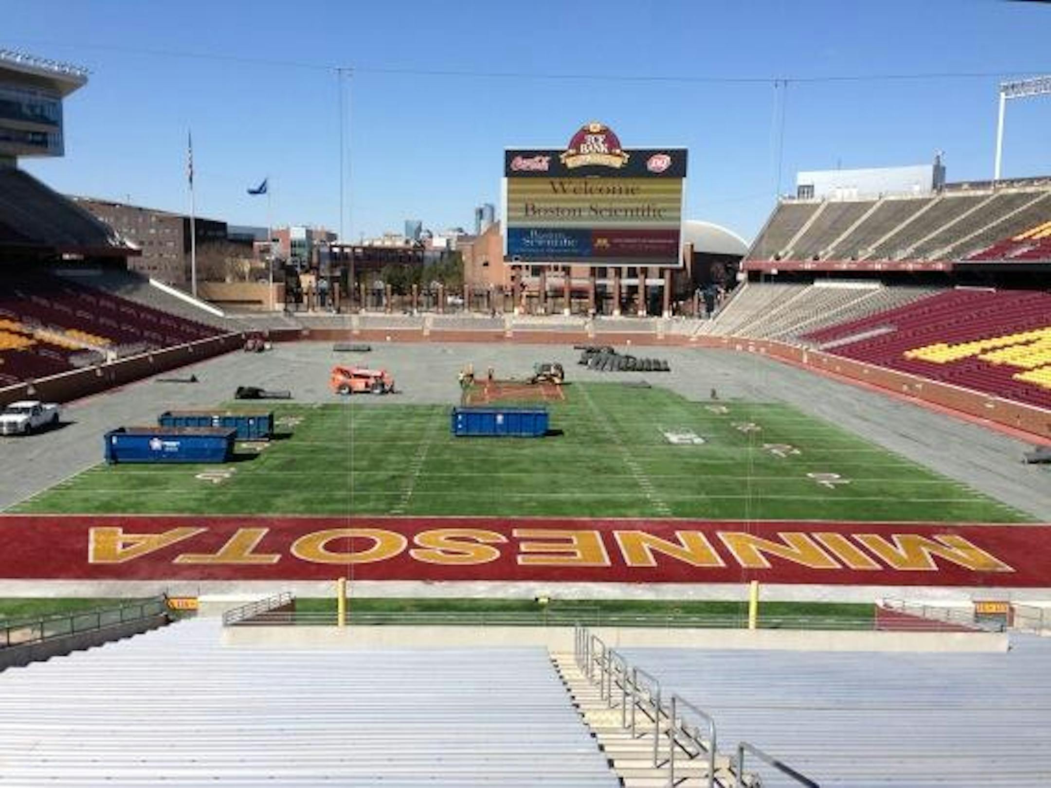 The process of updating TCF Bank Stadium for use by the Vikings is well underway, as we watched construction crews rip out the artificial surface field on Tuesday as they prepare to put heating elements in for the pro season.