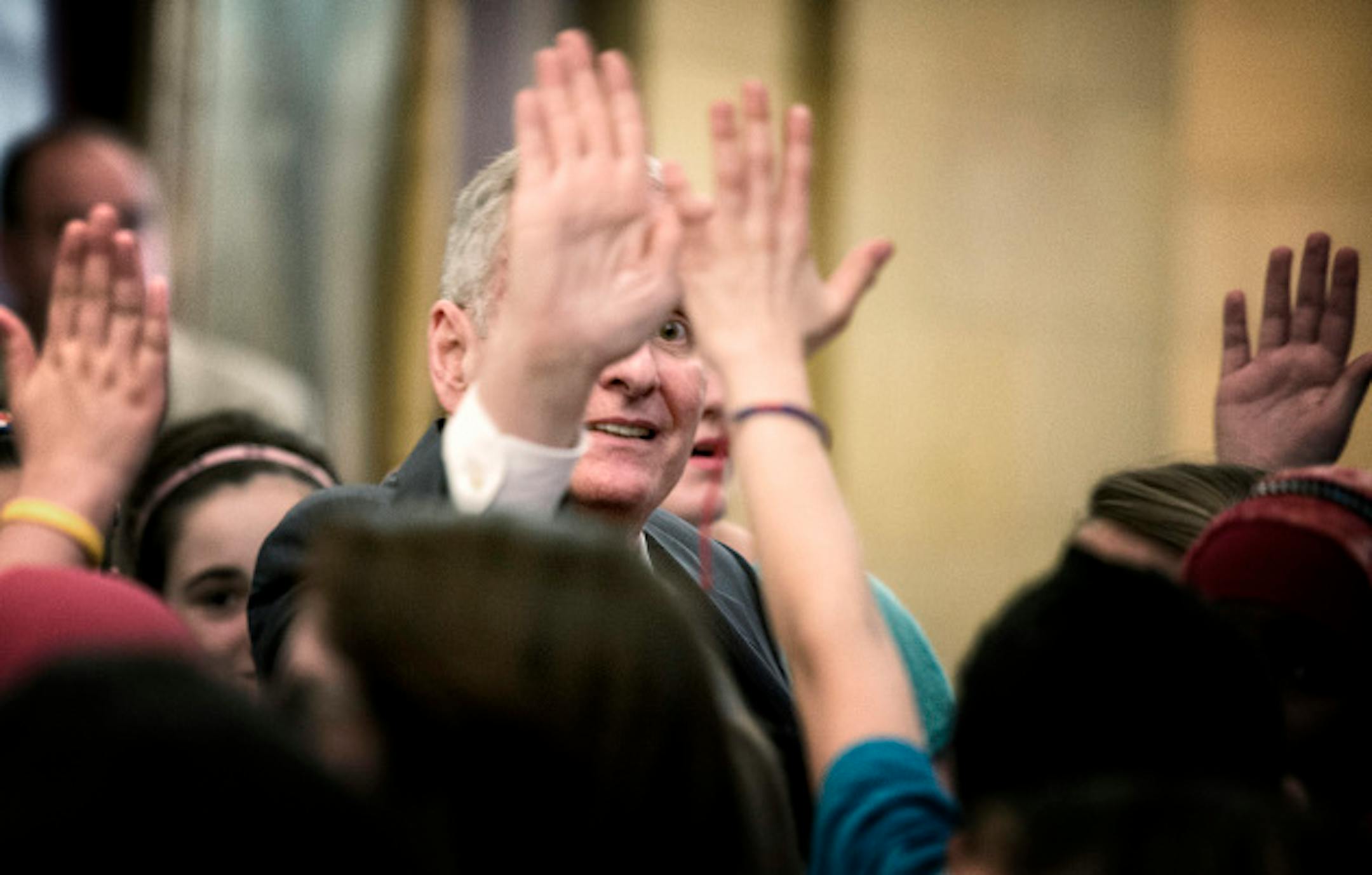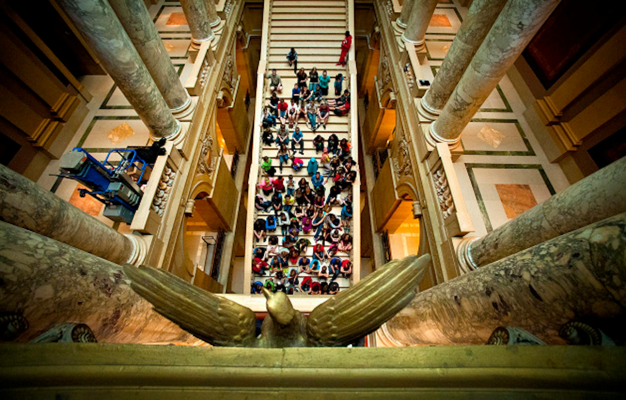 The Capitol is filled with visiting school groups this time of year from all across the state. Governor Mark Dayton stopped by to visit with some middle schoolers from Willmar posing for photos with the kids and high-fives all around.