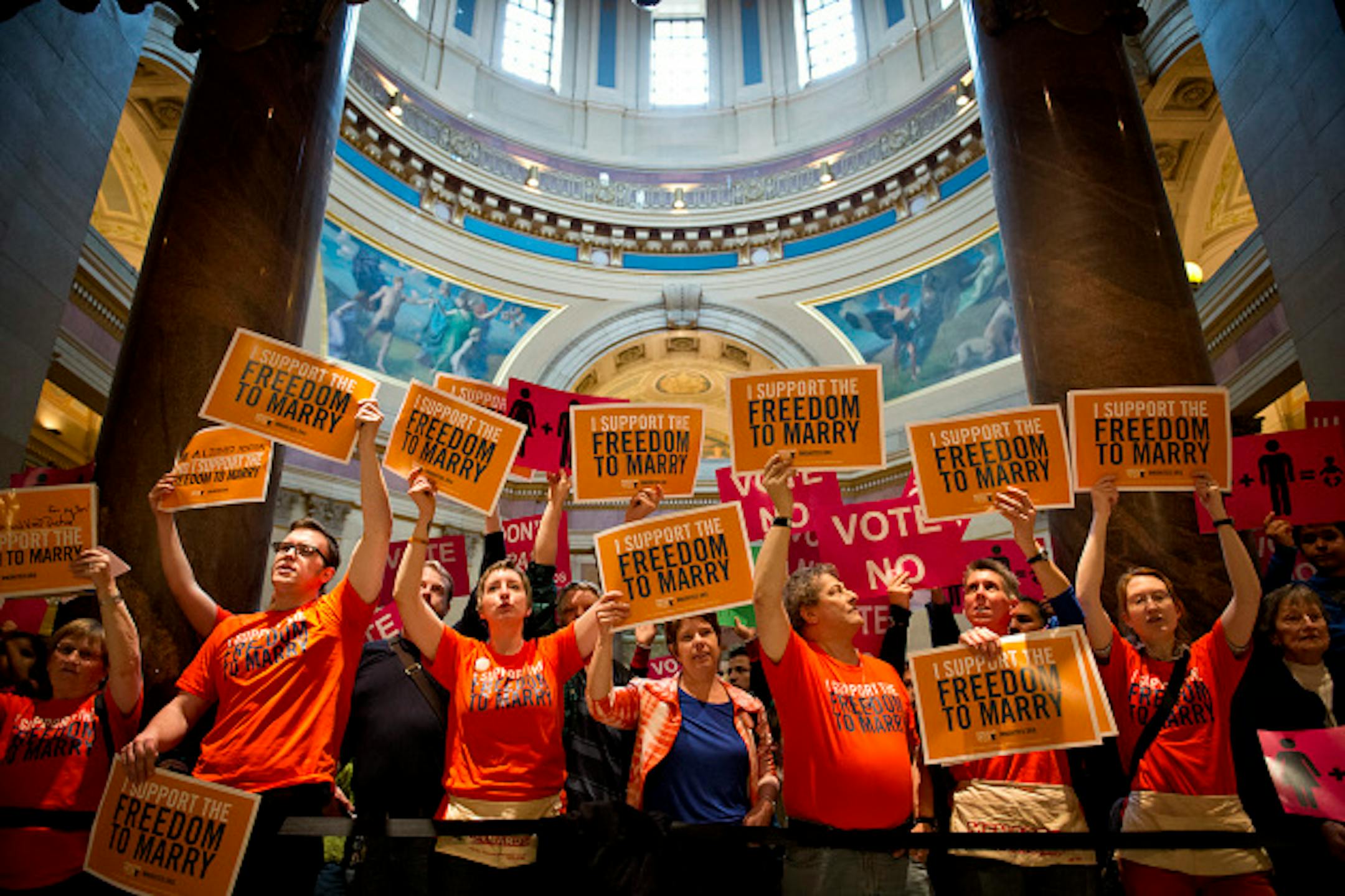 Advocates for both sides chanted, sang and pleaded as they lined the entrance to the House floor. The House takes up the same-sex marriage bill today, Thursday, May 9, 2013.