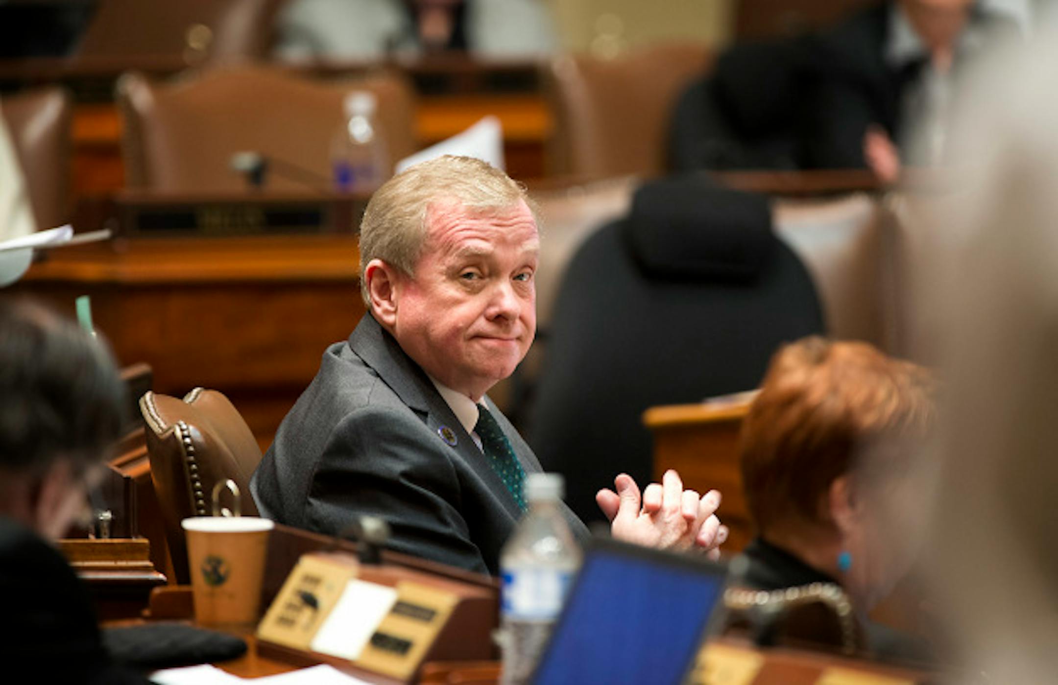 Author of the higher education bill Rep. Gene Pelowski, DFL-Winona, smiled as Rep. Glenn Gruenhagen, R-Glencoe, praised his bill and his role as chair of the higher education finance committee.