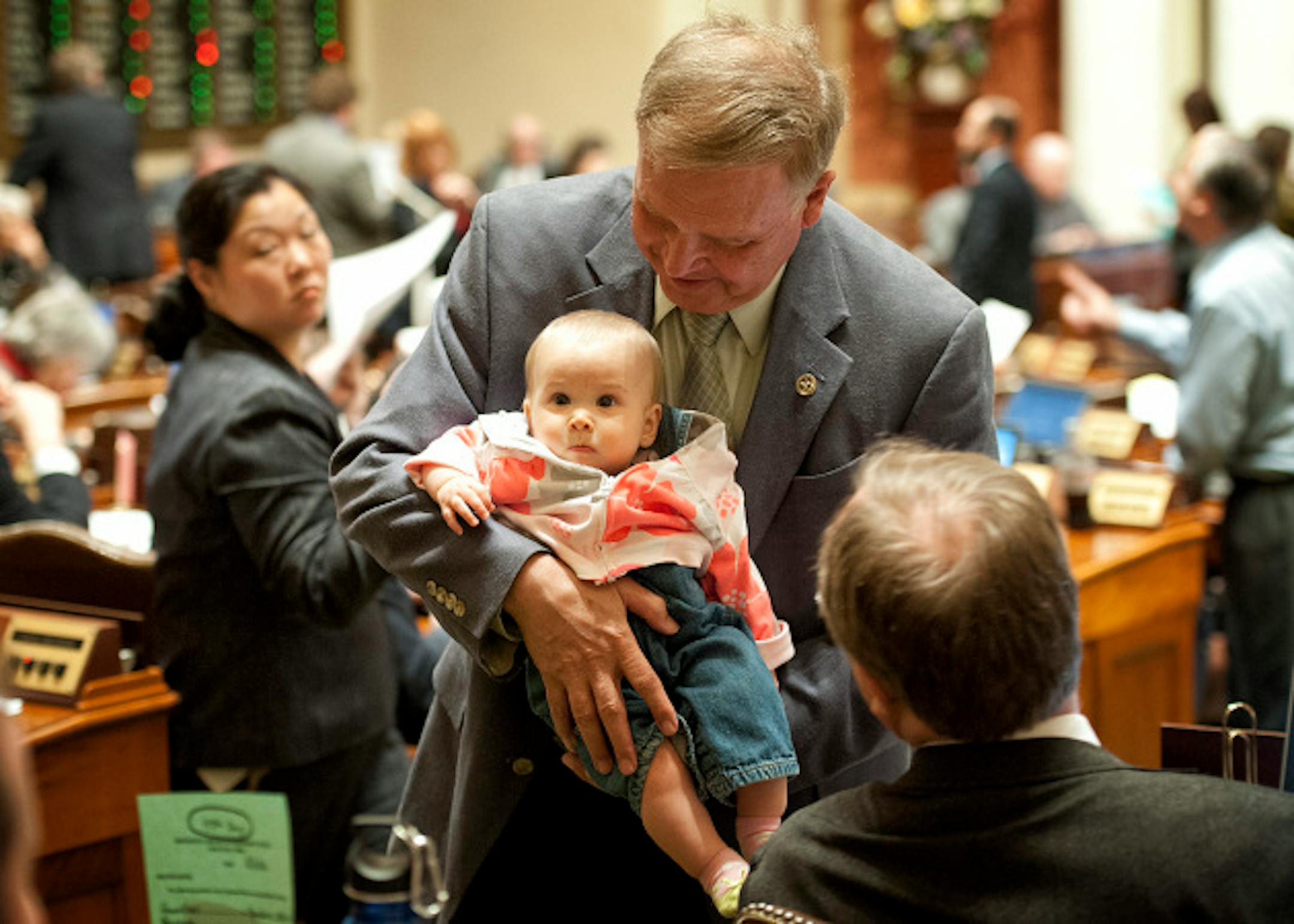 Rep. Dean Urdahl walked around the House floor with his granddaughter Bernadette, 8 months, during the debate.