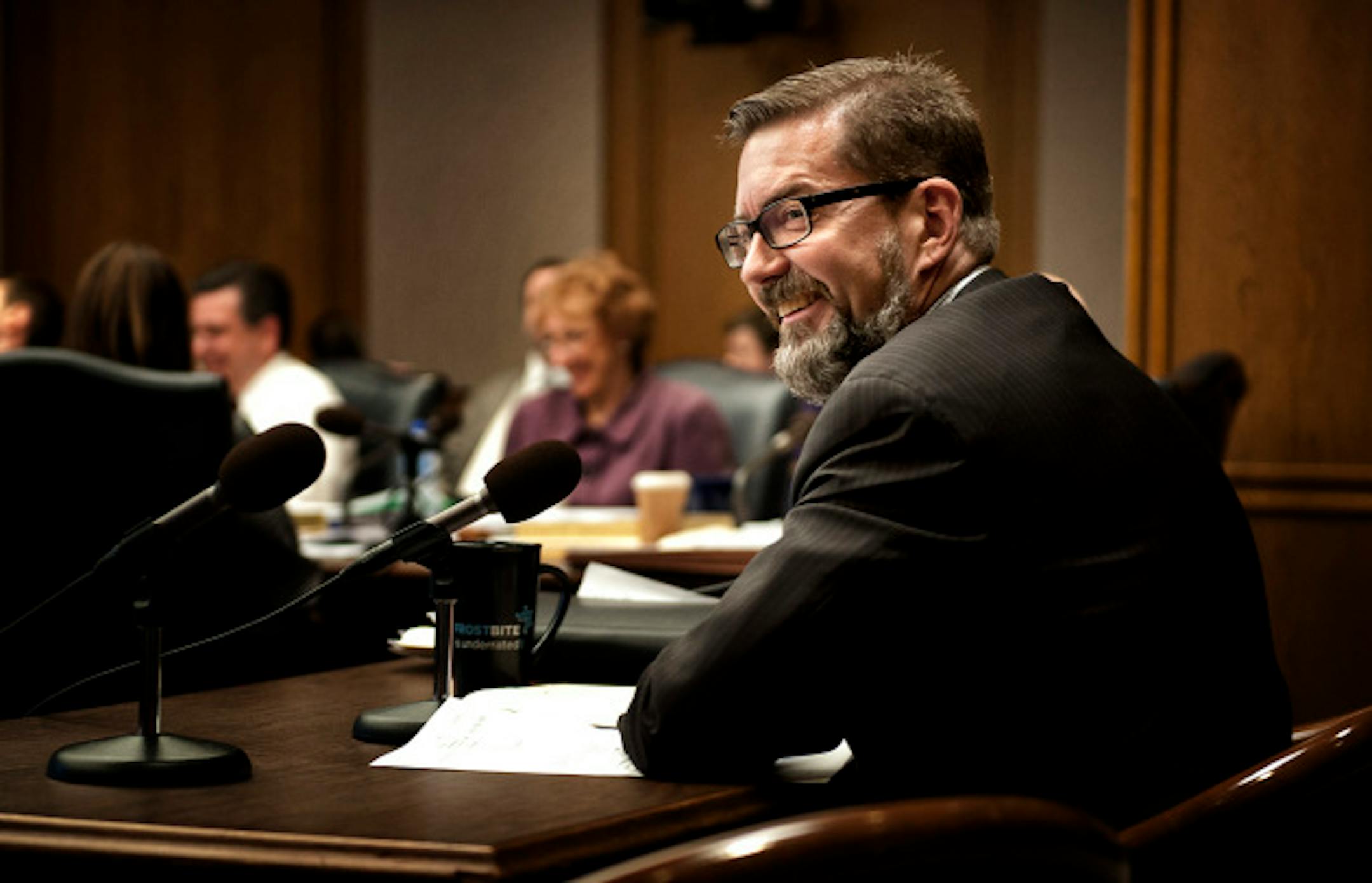 Senator Scott Dibble smiled after passage of his same sex marriage bill through the Senate Finance committee. The bill passed on a voice vote and now goes on to the House and Senate floors for debate.
