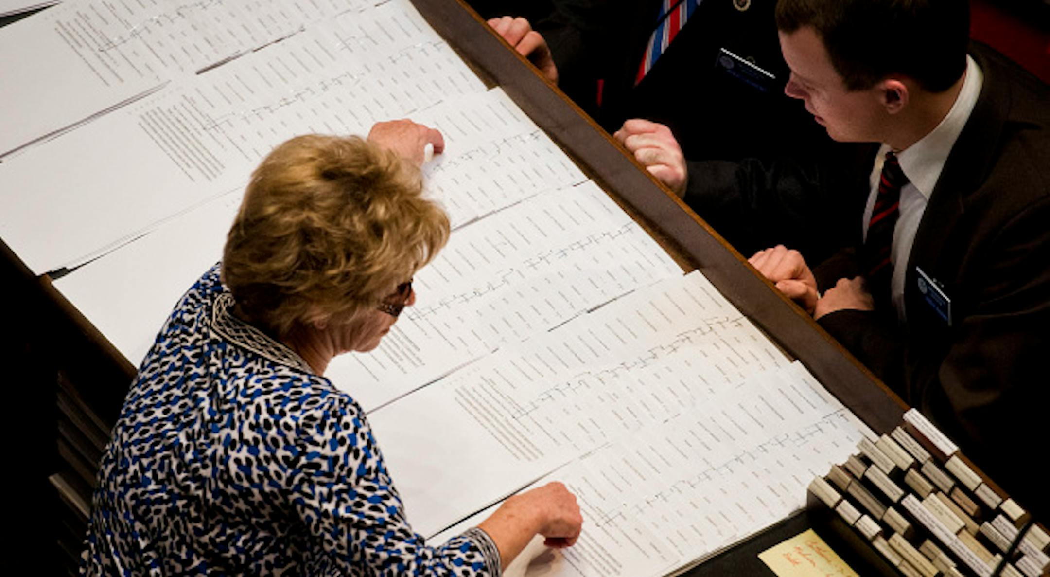 DFL Senator Tony Lourey held his face in his hand as GOP senators debated over the make up of the board of the health insurance exchange in the bill he sponsored on the Senate floor. This was the first of over 95 amendments lined up to be debated.