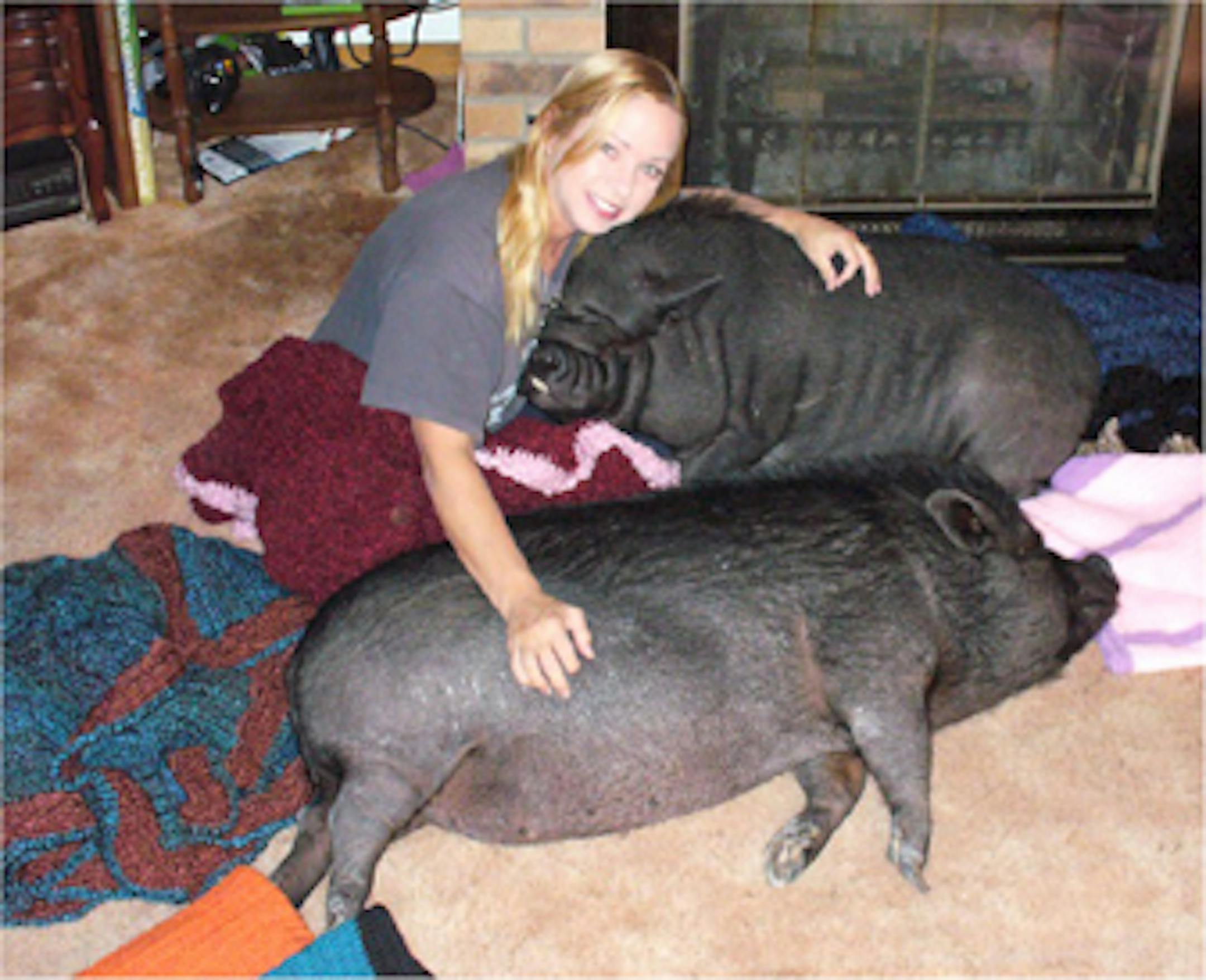When she brought little Ito home, the little piglet fit in the palm of Nikki's hand. It took constant feedings and around-the clock care, but Ito pulled through and was soon trotting about the house, spunky and healthy. Now Ito weighs an impressive one hundred forty-five pounds, and was joined several years ago by a rescued pig named Puggy Poo. To Nikki, they're simply known as "the girls."