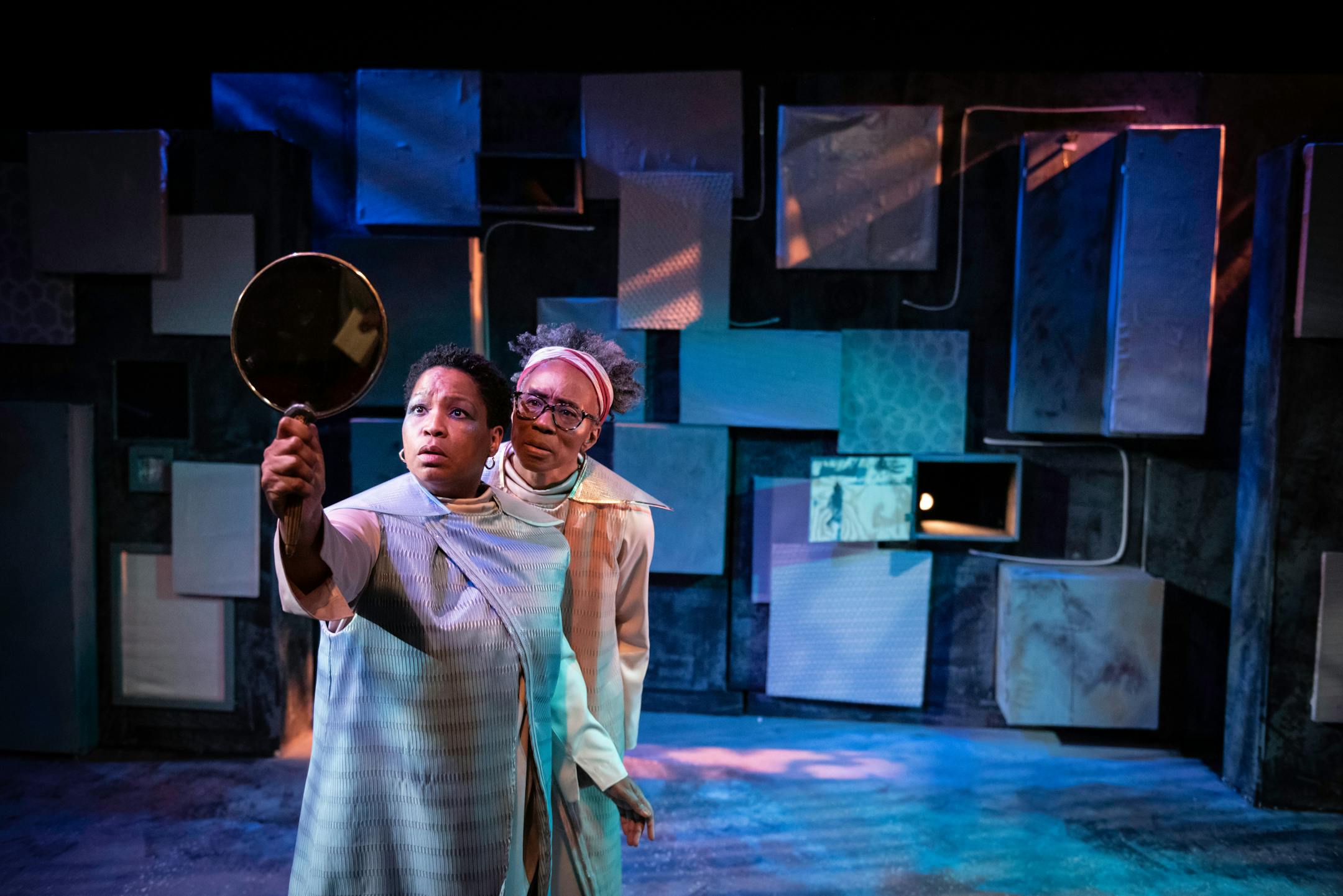 Dressed by Amber Brown in shimmery get-ups, the performers look space-age and rain-ready. They move in a scenography designed by Andrea Heilman to look like a vault or library whose precious treasures include lights and sounds. (Peter Morrow designed the soundscape, which includes songs and hollers coming through scratch and static.)