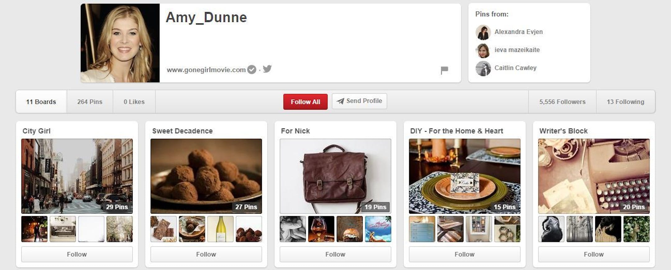Fall back into the twisted plot perusing her pinboards with titled "City Girl," "Call Me Missouri" and "The Bar." She's pinned recipes for boeuf bourguignon, homemade potato chips and lemon poppy seed muffins. Also, DIY projects involving painted maison jars and jewelry made from old brooches -- no word on whether she has tried or completed any of them.