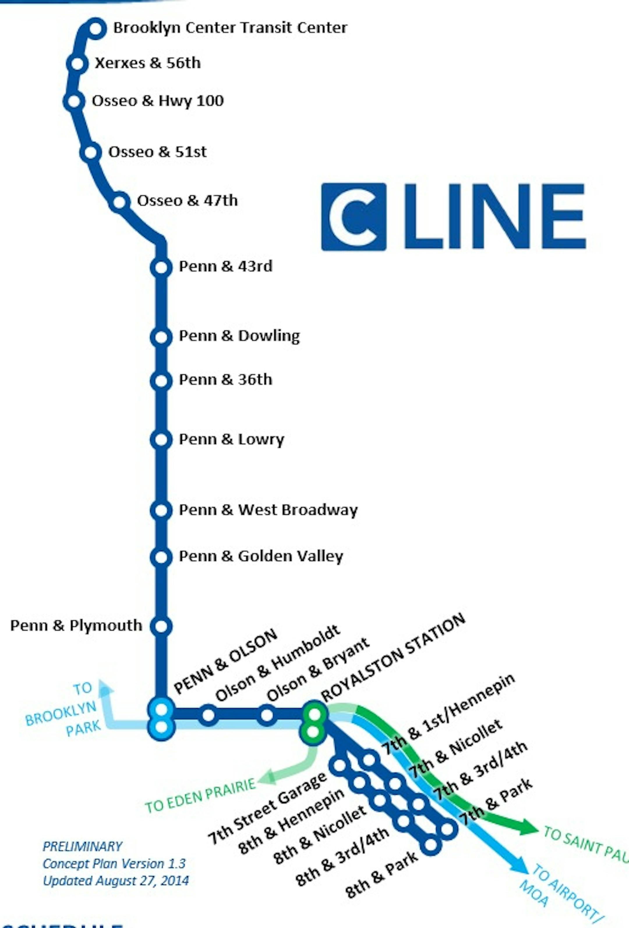 Metro Transit is proposing a new BRT Line, which would provide frequent service between Brooklyn Center Transit Center and downtown Minneapolis beginning in 2016. Known as the C-Line, buses would run every 10 minutes and stop only at stations every half mile along the line. Here is a map with the proposed stations. Service would begin in 2016.