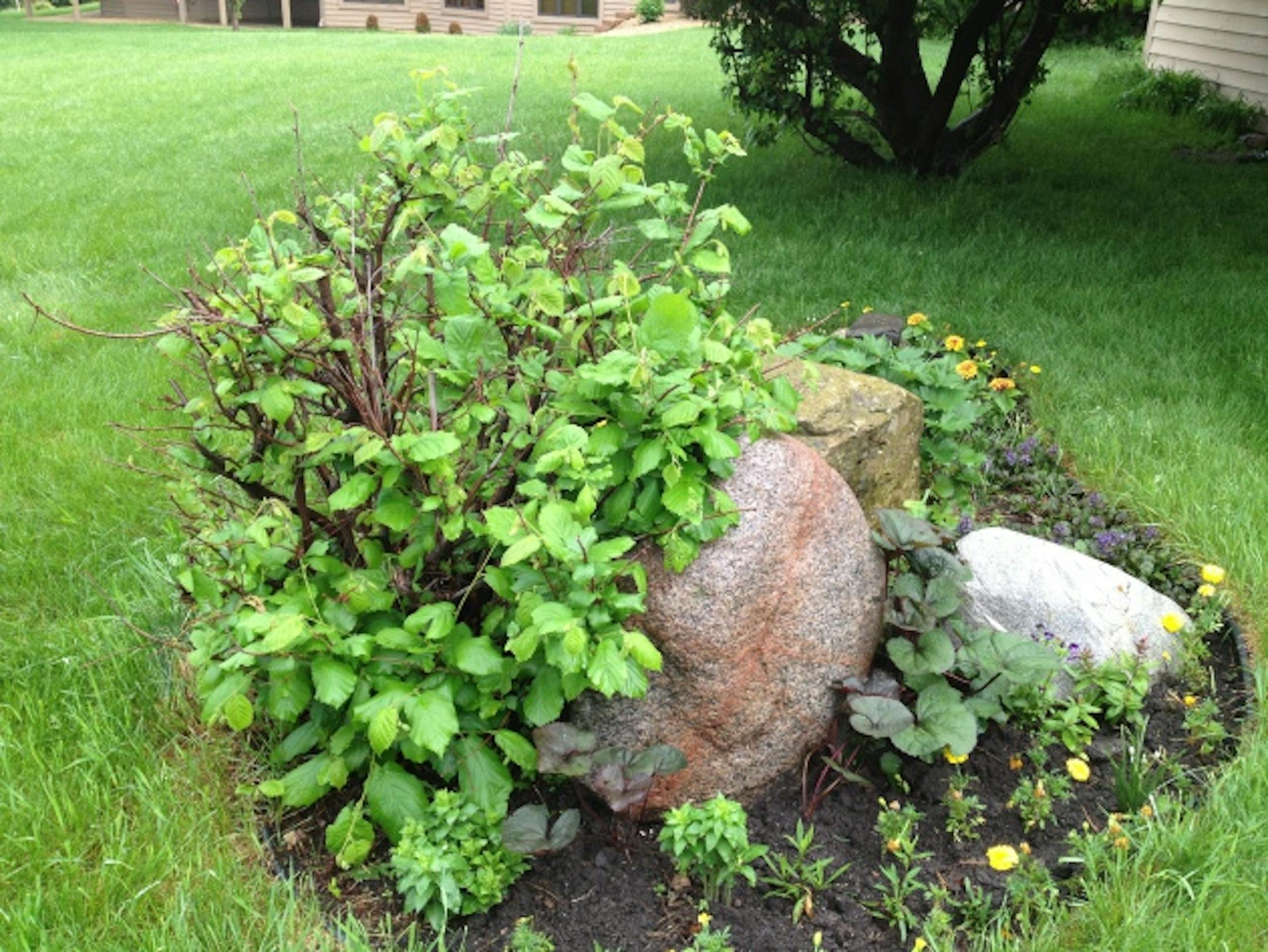 There's the contorted filbert I picked up at Home Depot about 10 years ago. It was small and quirky, with curly, twisty little branches. I put it in one of my garden beds next to a big boulder, thinking it would stay small and twisty and cute.