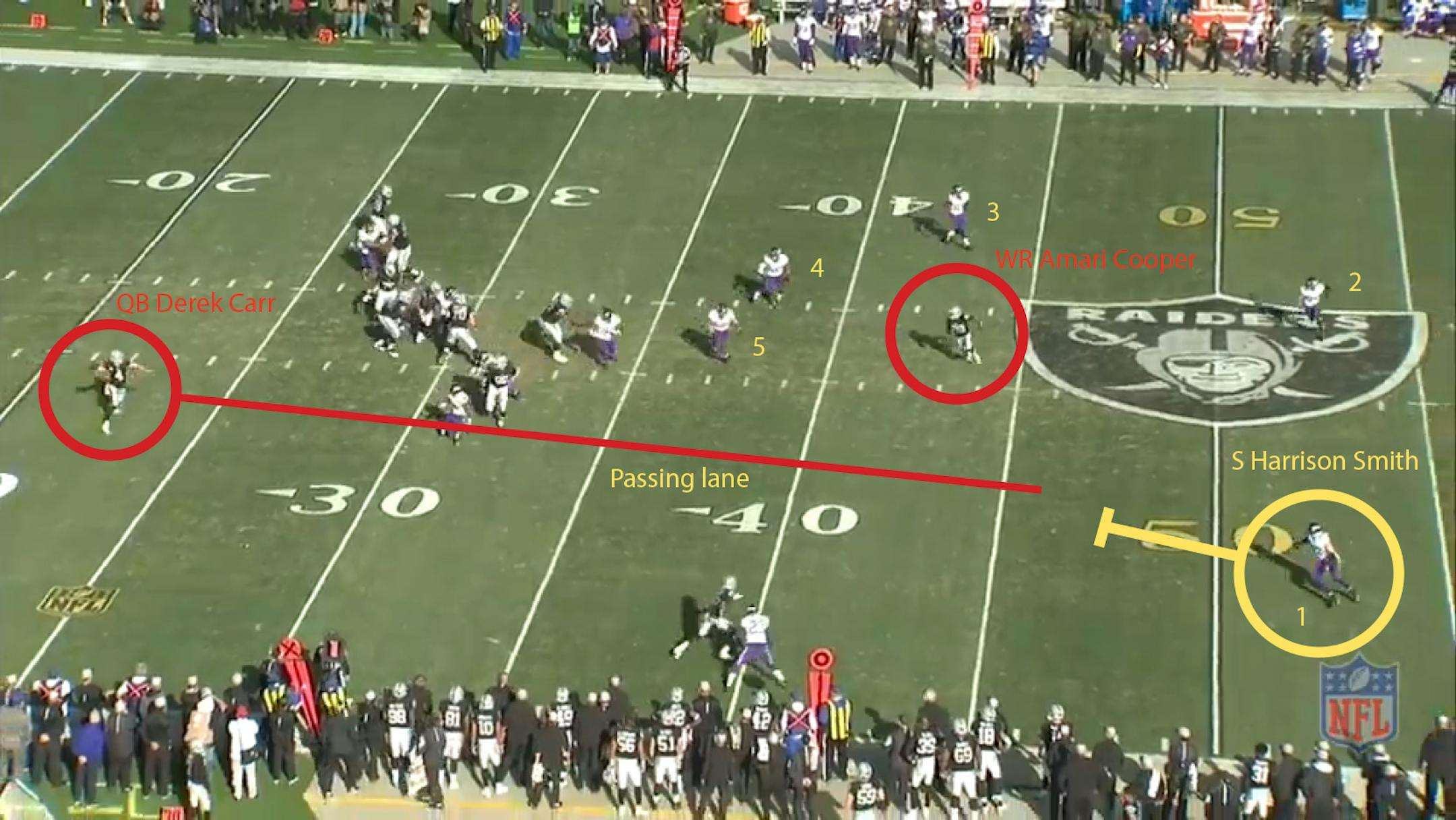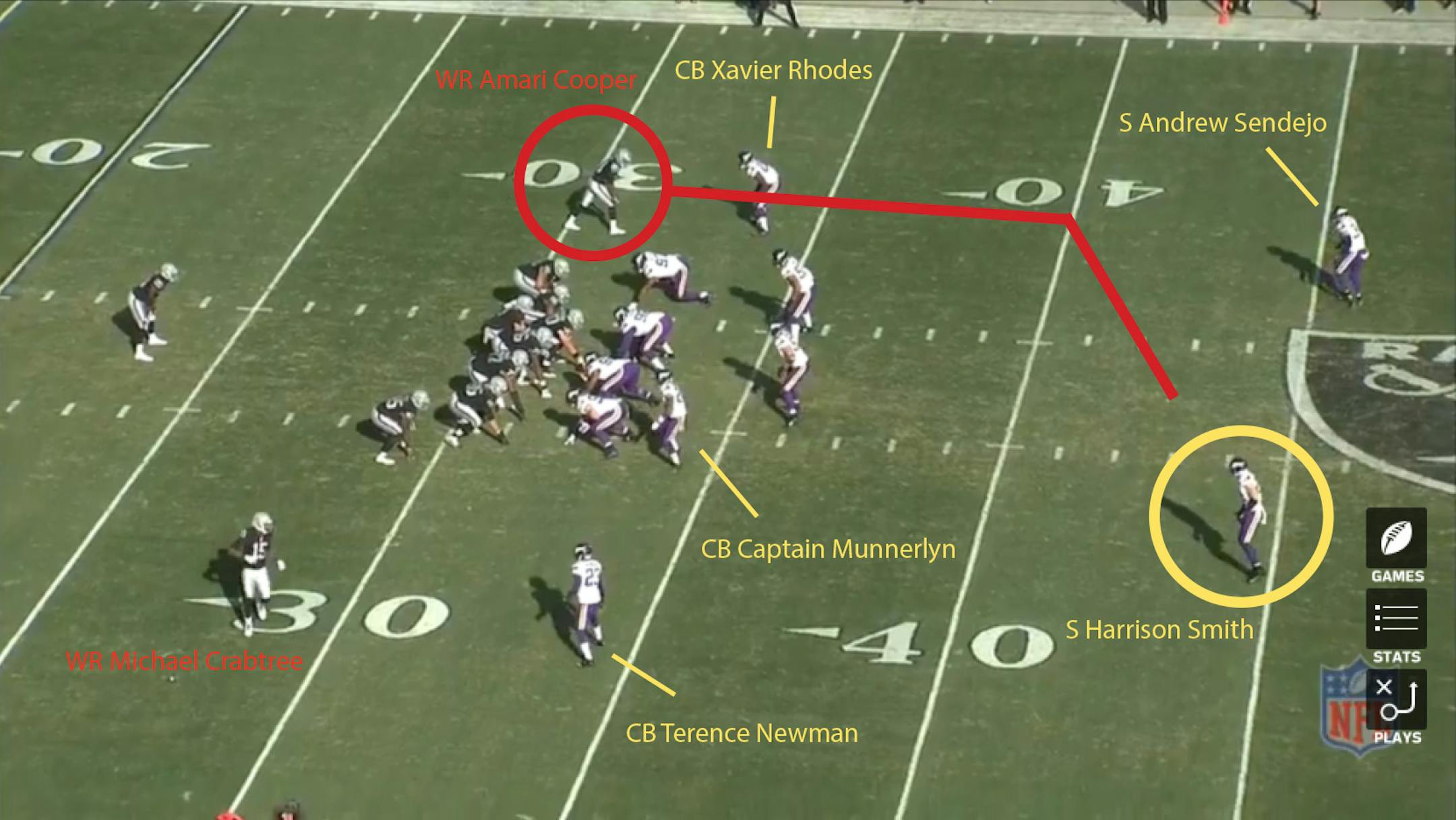 Frame 1: The Raiders lined up with a single set back and wide receivers Cooper to the left and Michael Crabtree to the right. The Vikings are in a nickel defense with Captain Munnerlyn up in the box. Cornerbacks Xavier Rhodes and Terence Newman line up with Cooper and Crabree, while safeties Andrew Sendejo and Smith line up to the right and left, respectively.