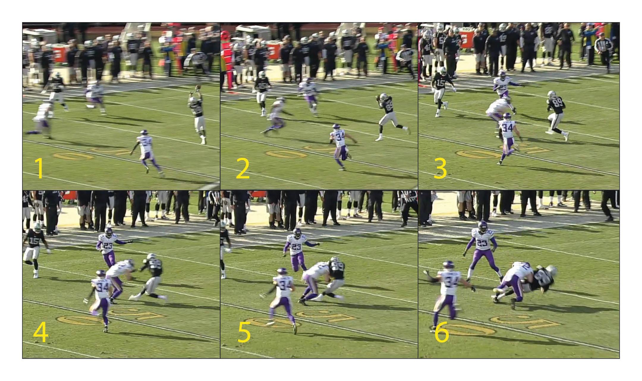 Frame 2: Cooper finds a hole in the middle of the field with five Vikings defenders surrounding him, but Smith adjusts quickly and isn't far behind Carr's completed pass. Smith steps up and delivers the hit moments after Cooper secures the ball.