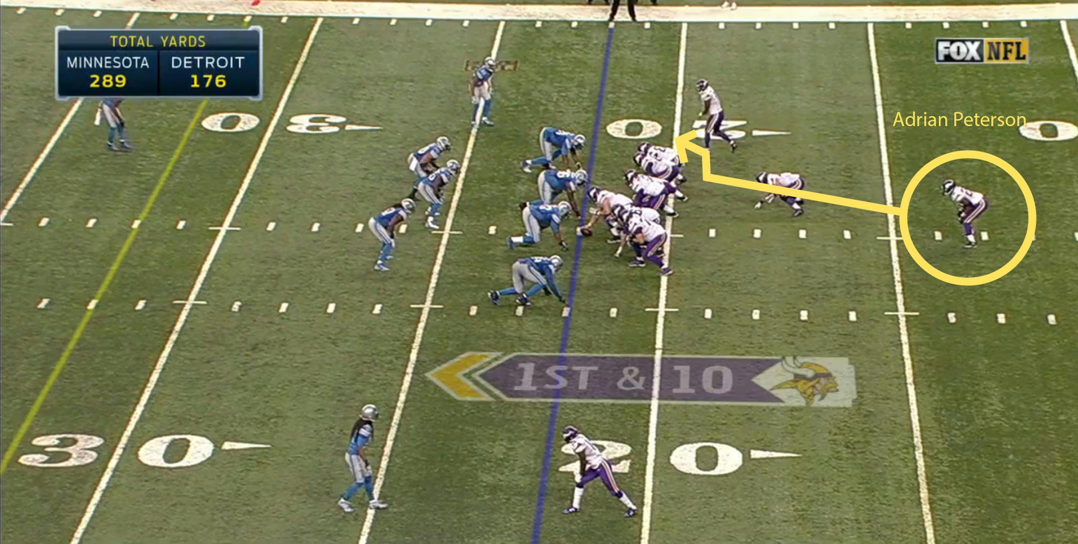 Frame 1: The Vikings lined up in an I-formation with fullback Zach Line as the extra blocker leading the way for Peterson against the Lions' 4-3 defense.
