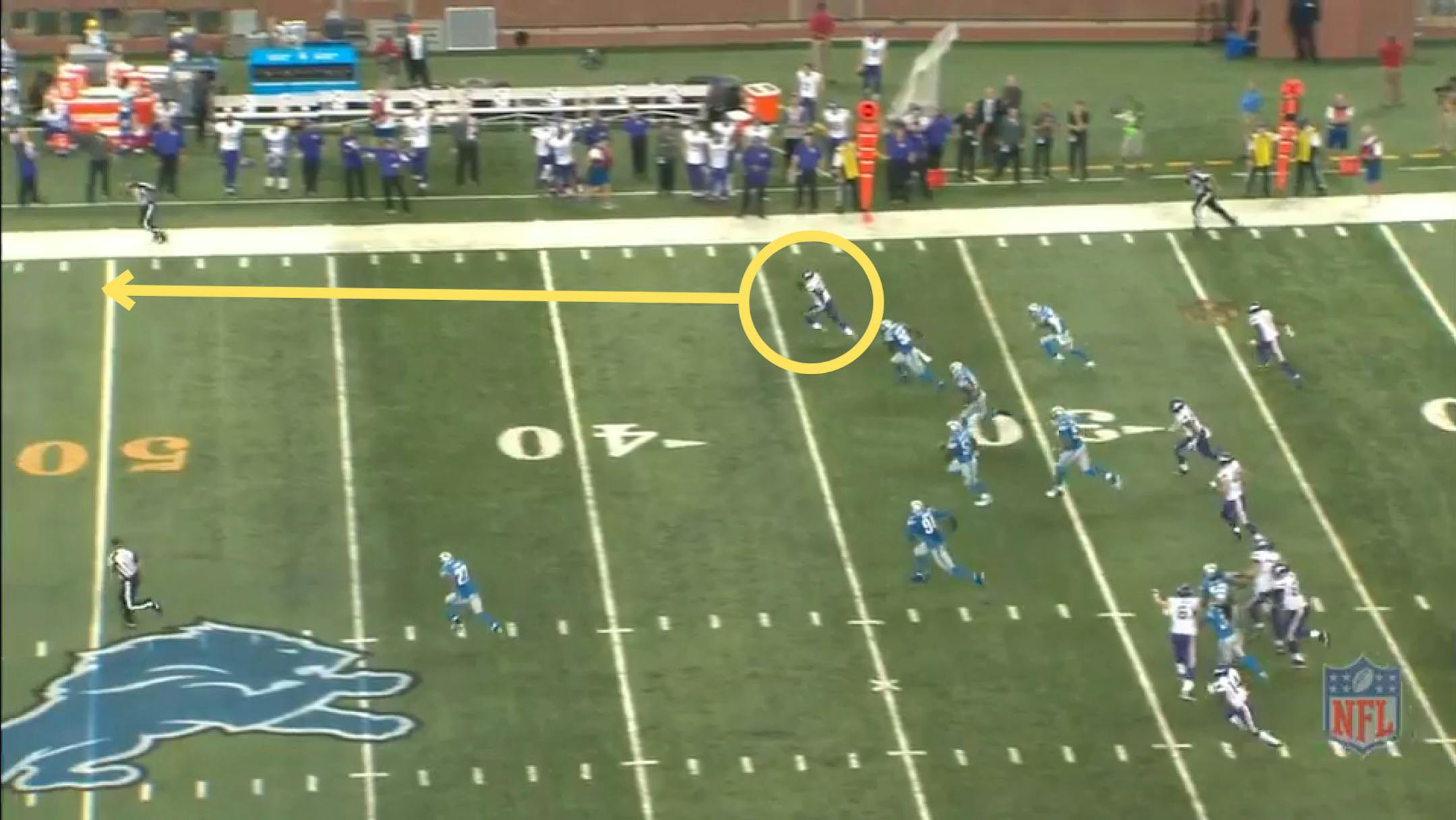 Frame 3: Once Peterson beats the second Lions defender, he has a lot of open field to work with. Defensive end Ezekiel Ansah saved the touchdown by knocking Peterson out of bounds at the three-yard line.