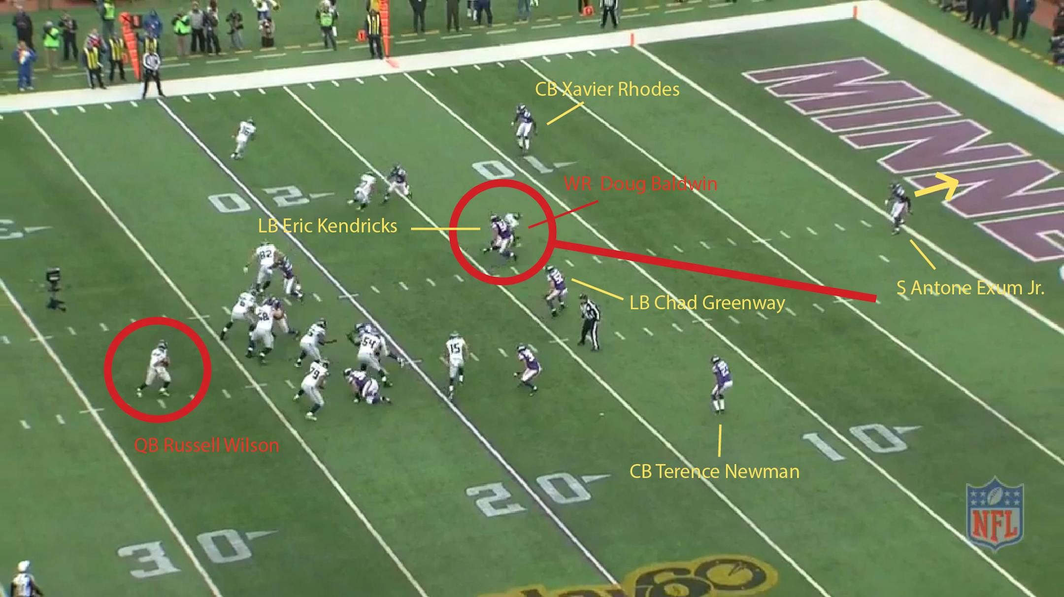 Frame 2: Seattle ran three vertical routes out of the trip side with an underneath crossing receiver. Baldwin cuts inside past Vikings linebacker Eric Kendricks to find a opening in the middle of four defenders. Greenway squeezes into the middle of the field and opens up the passing lane for Wilson, while Exum drifts back just enough to give Baldwin the room he needs to secure the catch.