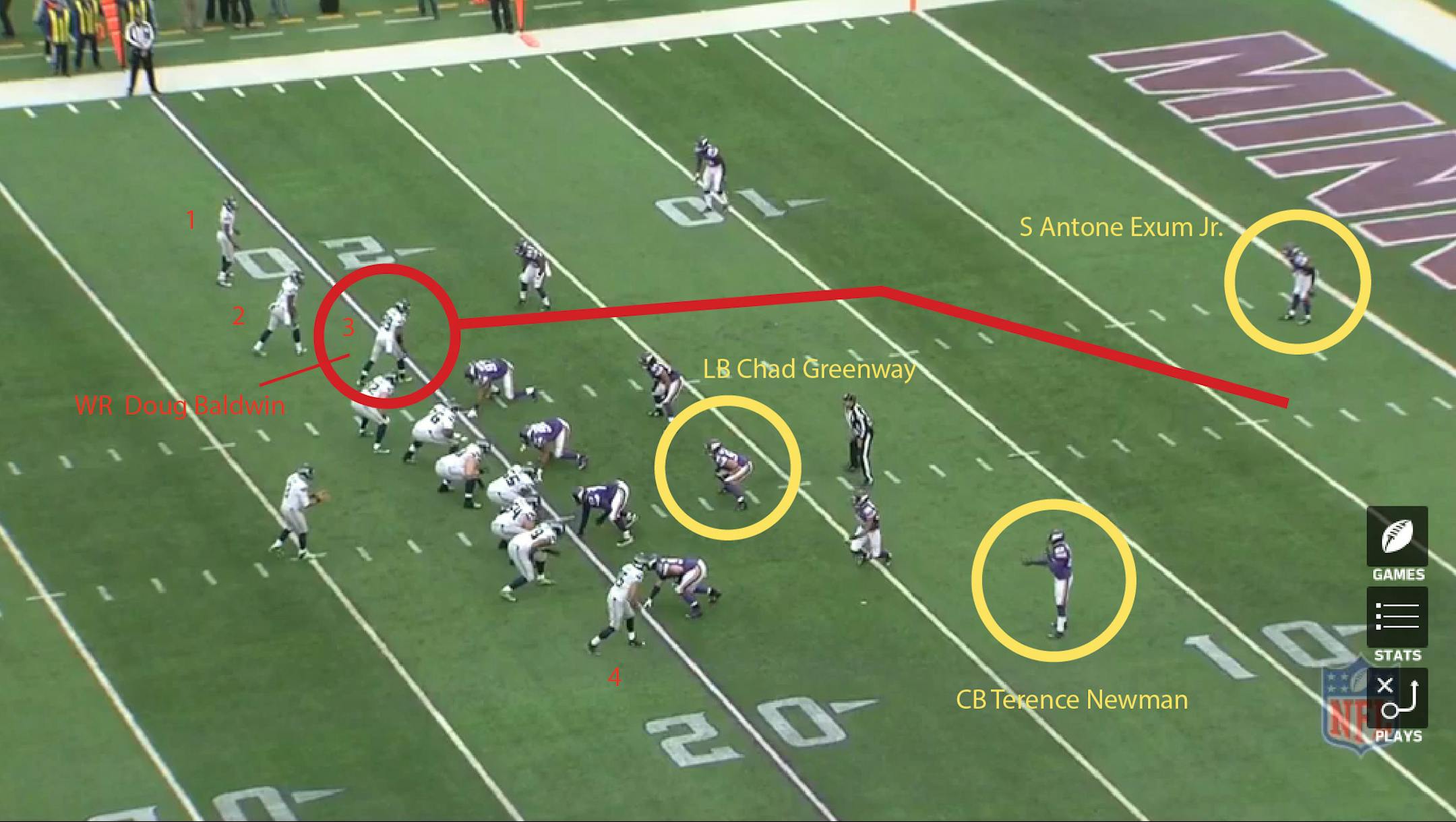 Frame 1: The Seahawks lined up in a shotgun four wide-receiver set with one tight end. Baldwin lined up to the left. The Vikings were in nickel personnel running zone coverage with four deep defenders and three in the underneath zone. Safety Antone Exum Jr., cornerback Terence Newman and linebacker Chad Greenway, who will all factor into the play, are lined up to the right.