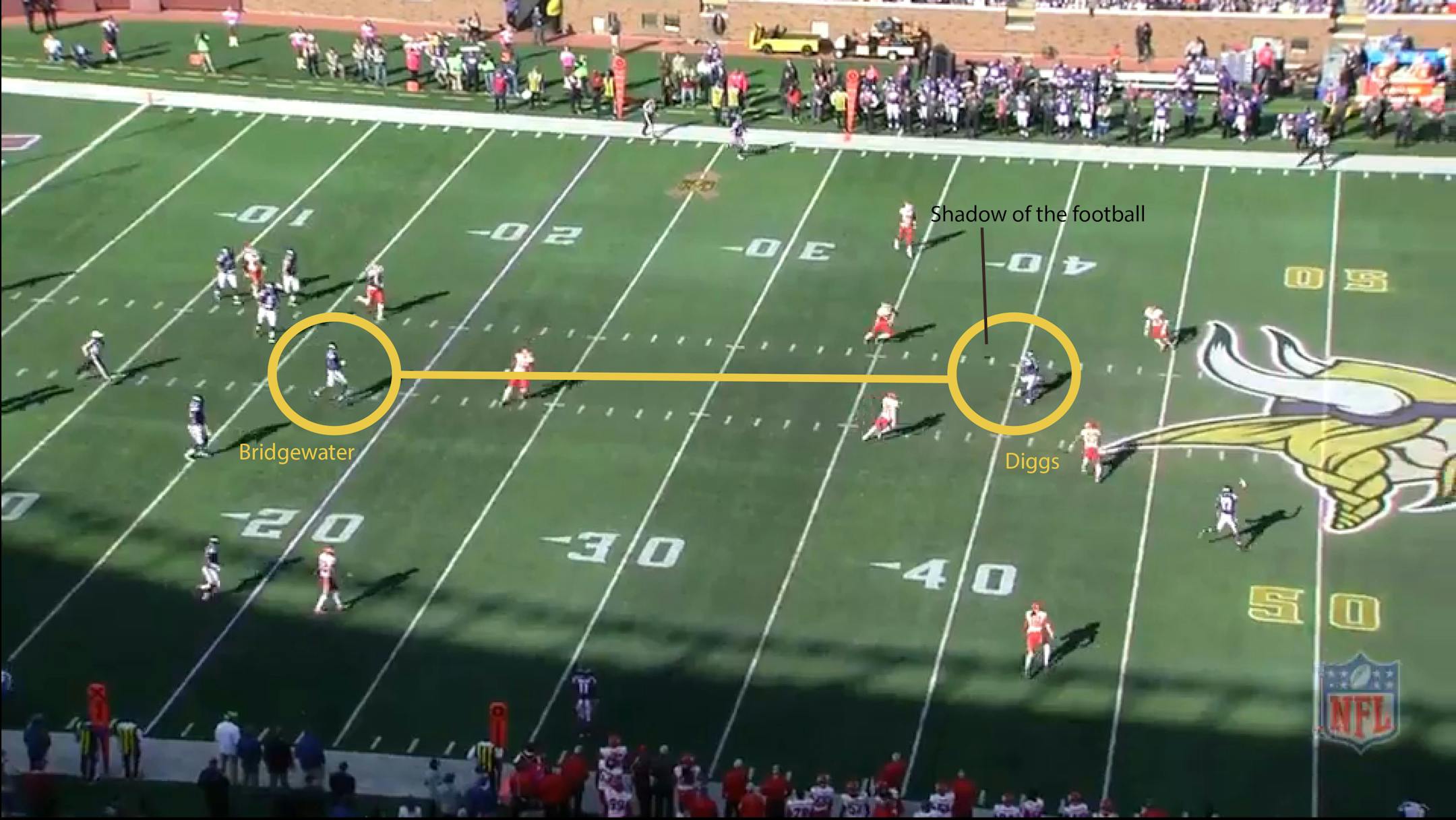 Frame 2: Quarterback Teddy Bridgewater looks left Diggs, but nothing is there. The offensive line, however, does a great job protecting Bridgewater (six blockers in this frame) and he finds a hole to keep the play alive.
