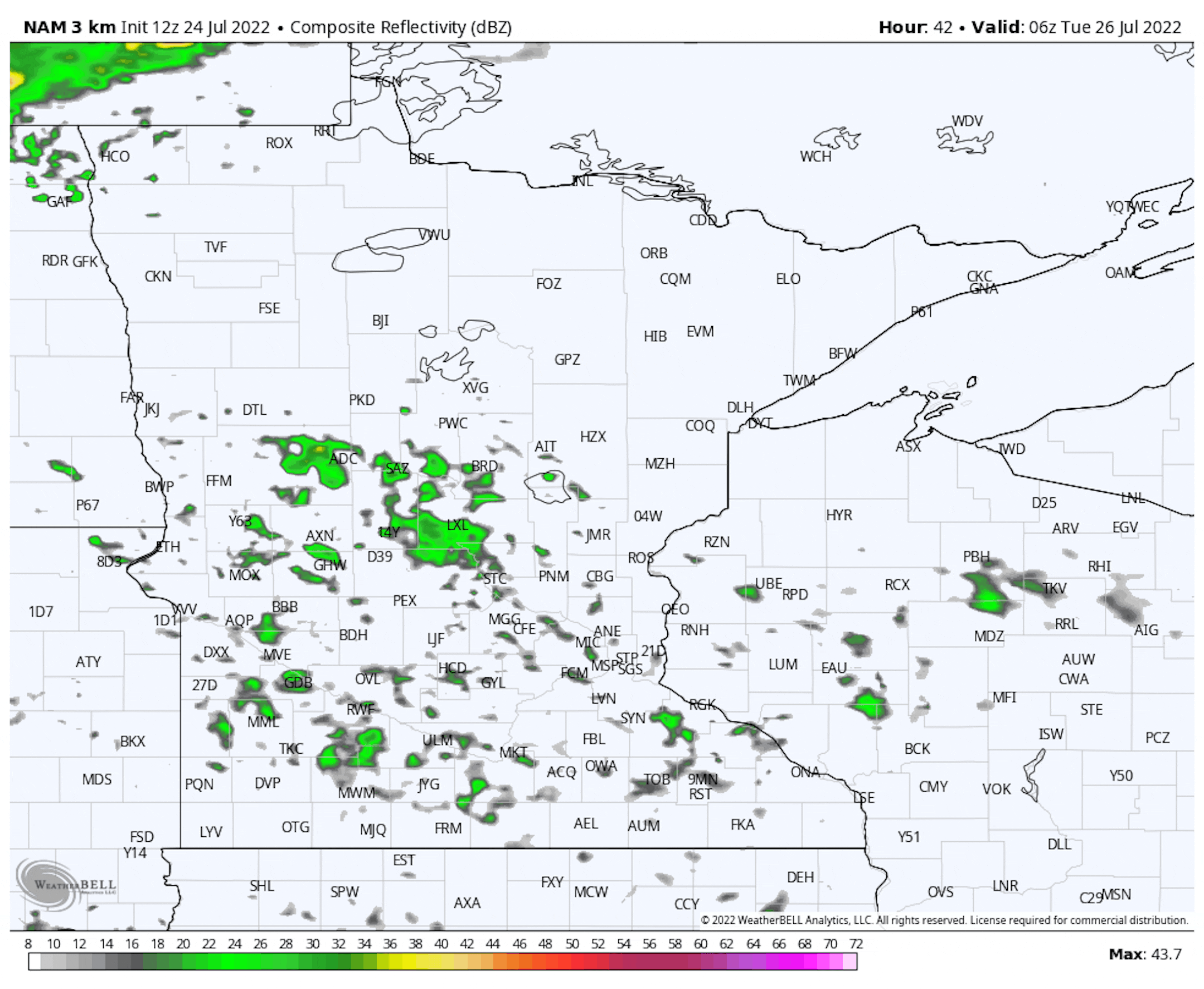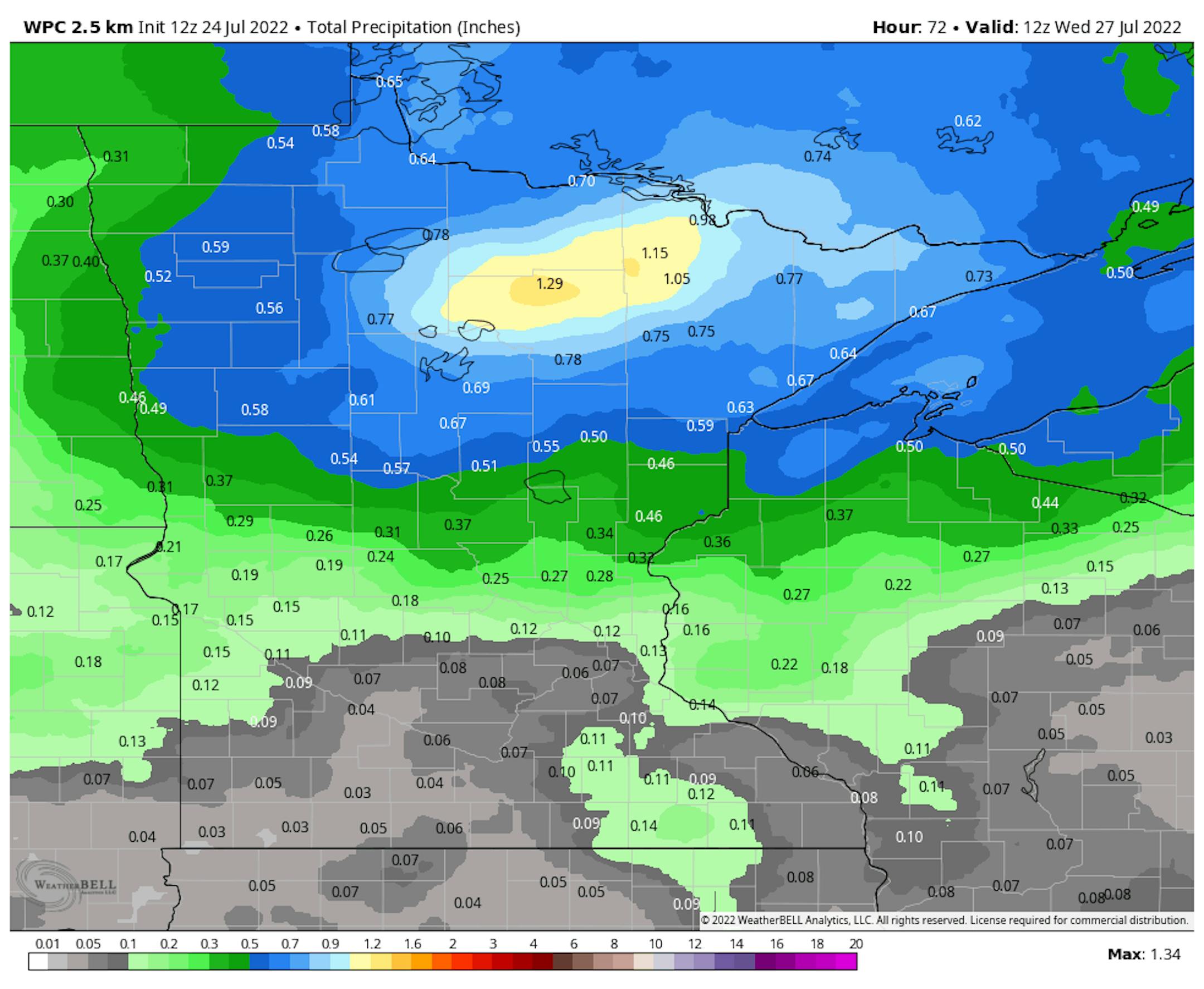 A fairly nice day is expected statewide for the last third of July, with highs that are around to a few degrees below average with mainly sunny skies for most to at least start the day. A few more clouds are expected to be moving on through during the afternoon. A shower or storm might be possible in far southwestern Minnesota, but rain amounts aren't expected to add up to much.