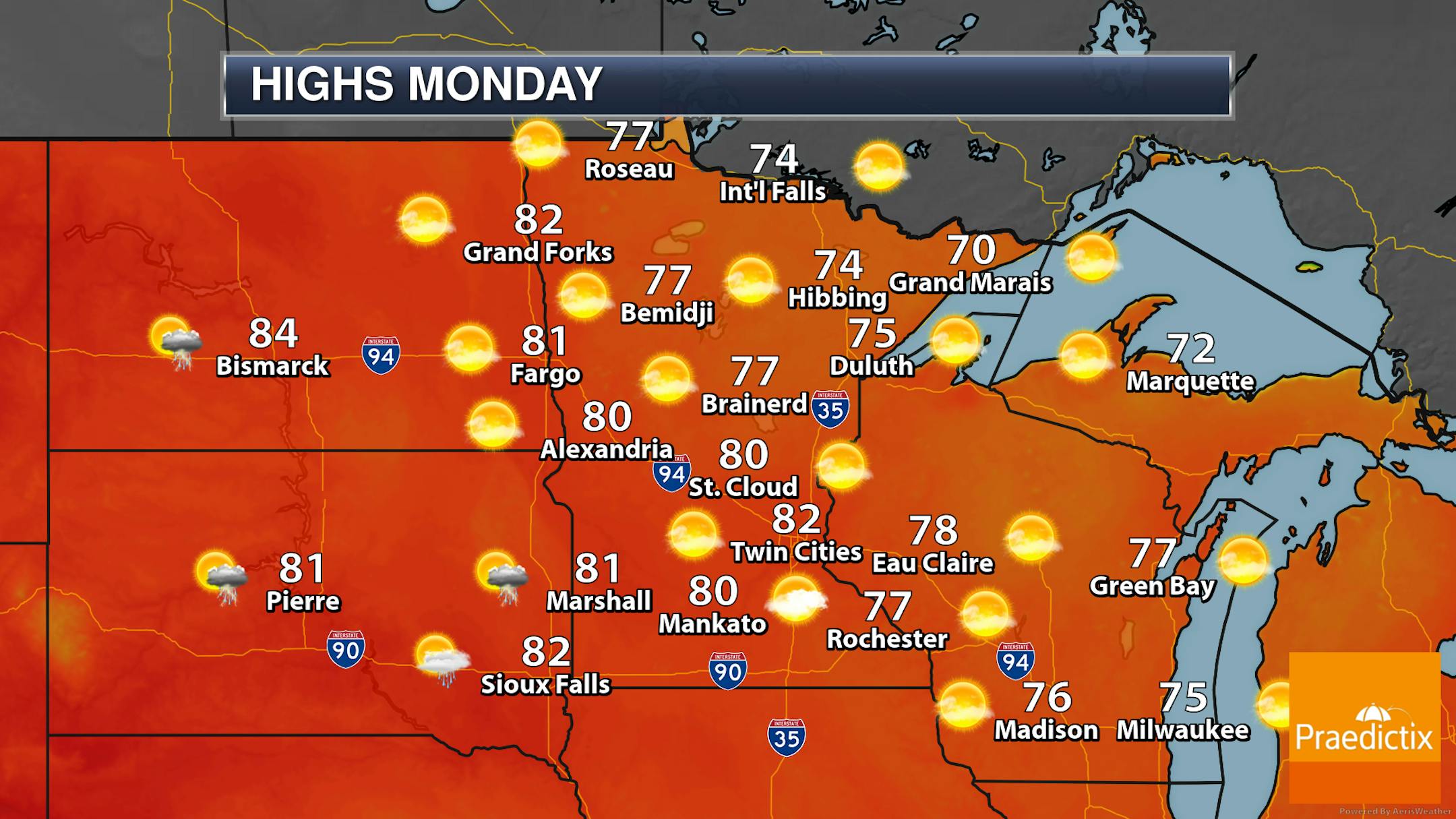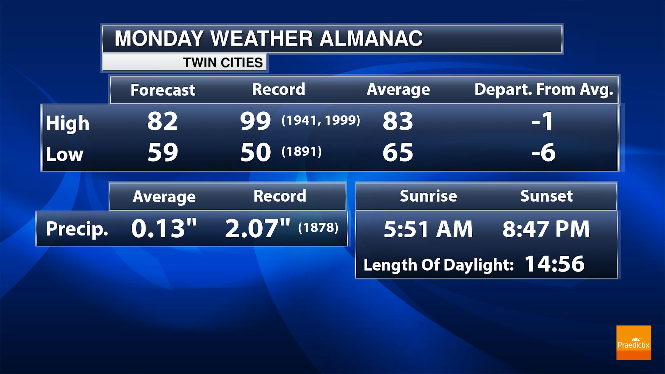 Another mainly sunny day (with a few more clouds in the afternoon vs. the morning) is expected on Monday in the metro with temperatures slightly warmer than Sunday. We'll start off the day right around 60F with highs climbing into the low 80s. Winds also won't be as strong as they were Sunday - out of the west to west-southwest up to 10 mph.