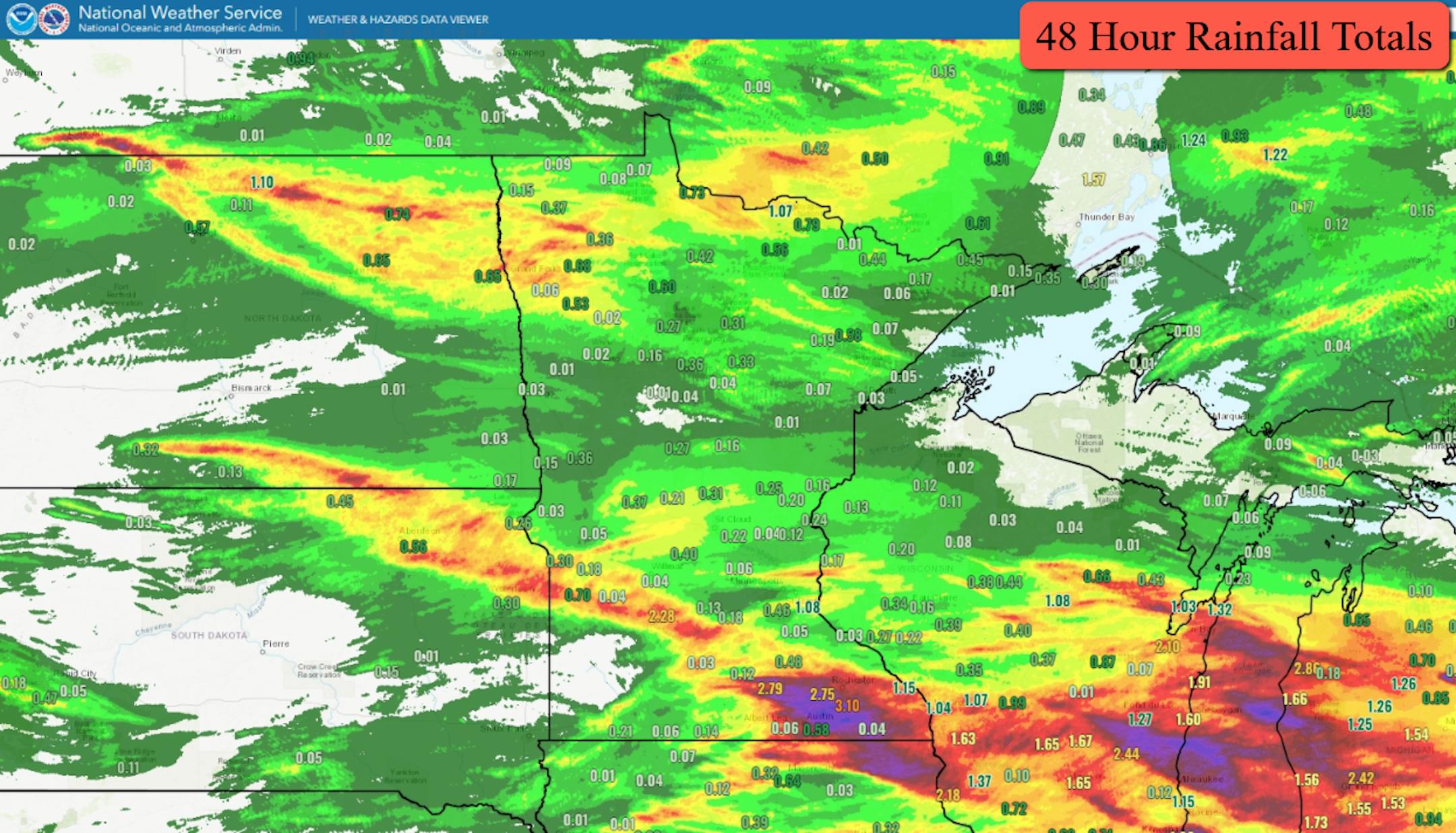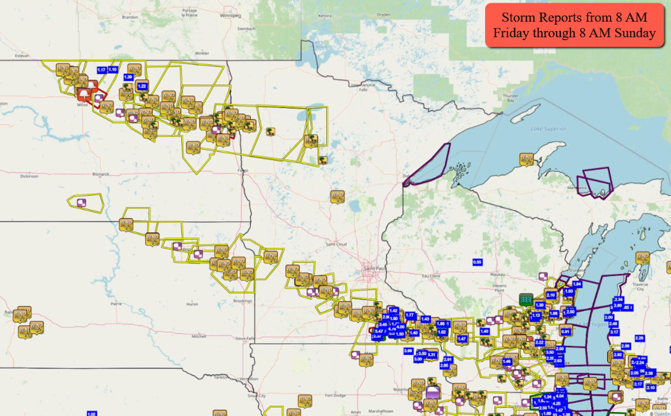 Strong storms impacted the state from Friday night through Saturday, bringing heavy rain and mainly strong winds. The peak wind gust occurred in Mallory up in northwestern Minnesota where a wind gust of 80 mph was reported at 1:25 AM Saturday. The peak wind across southern Minnesota was 71 mph at the Olivia airport at 10:28 AM Saturday.
