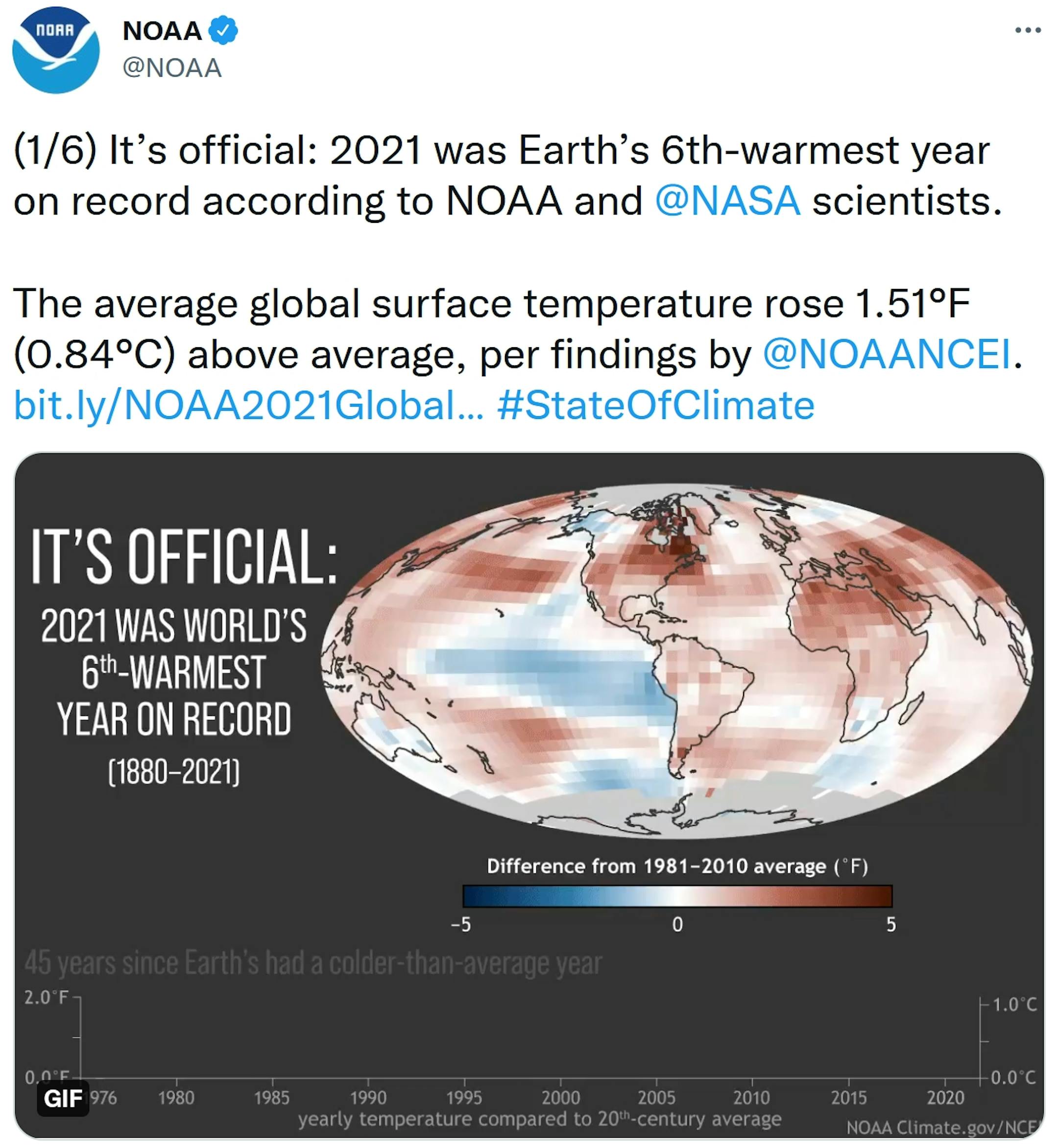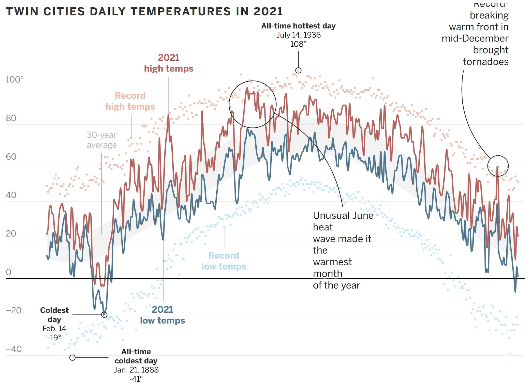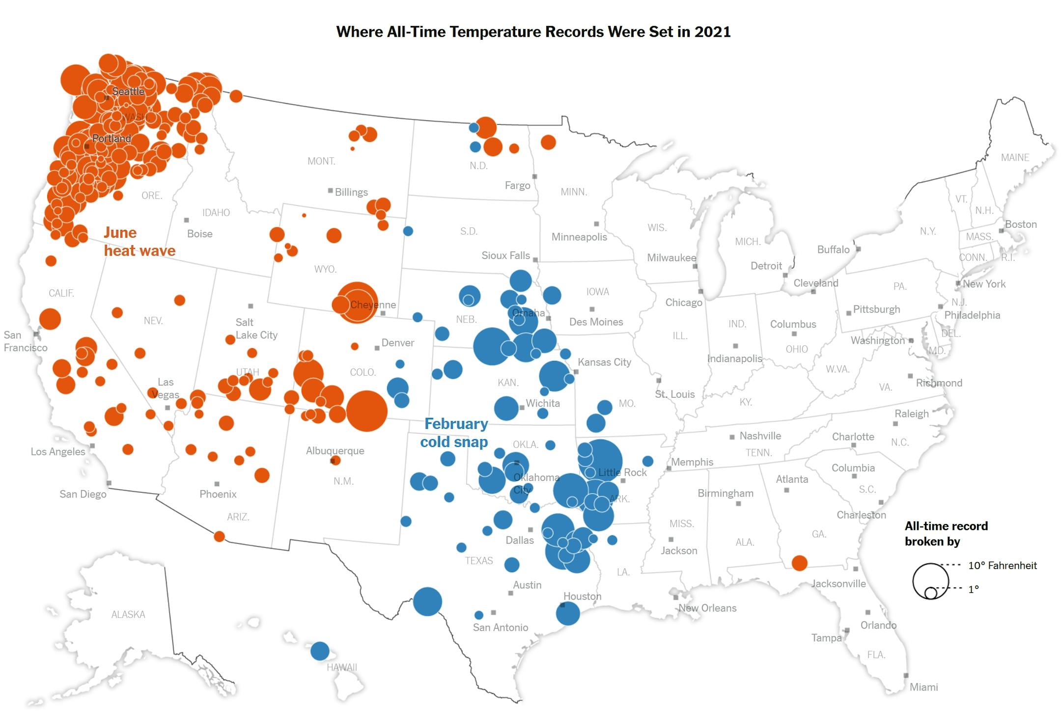 A Vivid View of Extreme Weather: Temperature Records in the U.S. in 2021. The New York Times (paywall) has details: "Temperatures in the United States last year set more all-time heat and cold records than any other year since 1994, according to a New York Times analysis of Global Historical Climatology Network data. Heat waves made up most of these records. All-time heat records were set last year at 8.3 percent of all weather stations across the nation, more than in any year since at least 1948, when weather observations were first digitally recorded by the U.S. government. The world has been warming by almost two-tenths of a degree per decade. Extreme-temperature events can often demonstrate the most visible effects of climate change. "We do not live in a stable climate now," said Robert Rohde, the lead scientist at Berkeley Earth, an independent organization focused on environmental data science. "We will expect to see more extremes and more all-time records being set..."