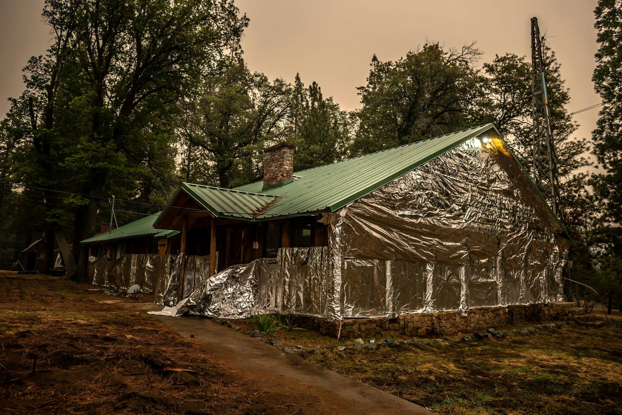 A U.S. Forest Service building in Johnsondale was wrapped in an aluminized material to protect it from the heat and embers of the nearby Windy fire on Sept. 19, 2021. (ProPublica/The Minnesota Star Tribune)