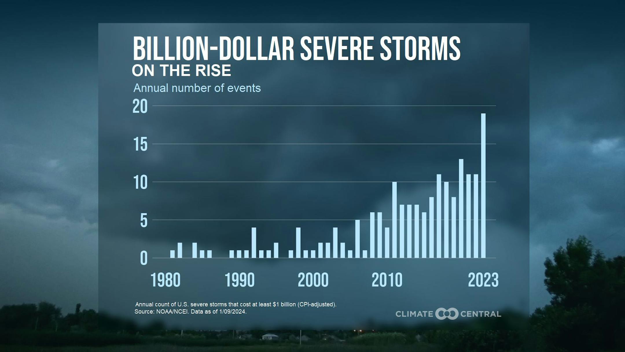 - Severe storms accounted for 19 (68%) of all billion-dollar disasters in 2023 — part of a rising trend of costly, dangerous, and deadly severe storms in the U.S.