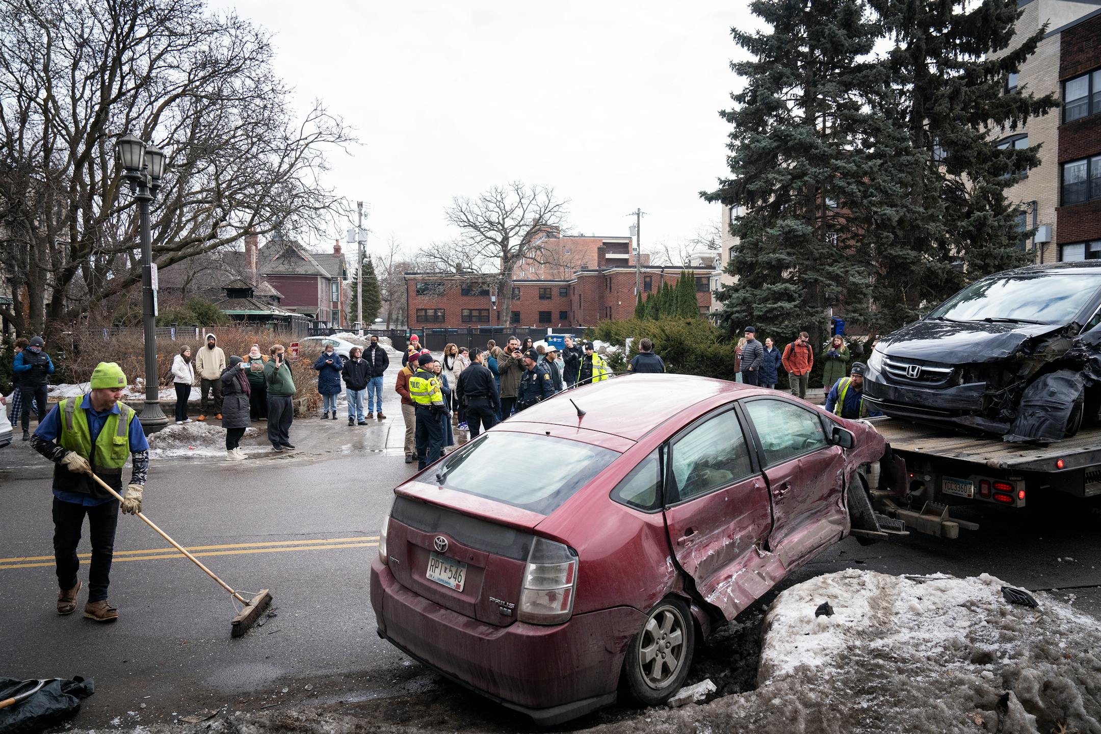 A high-speed car chase in St. Paul on Feb. 11 involving a federal immigration enforcement agent ended with a multi-vehicle crash and injuries to the fleeing driver, who was taken away in an ambulance as a crowd looked on.