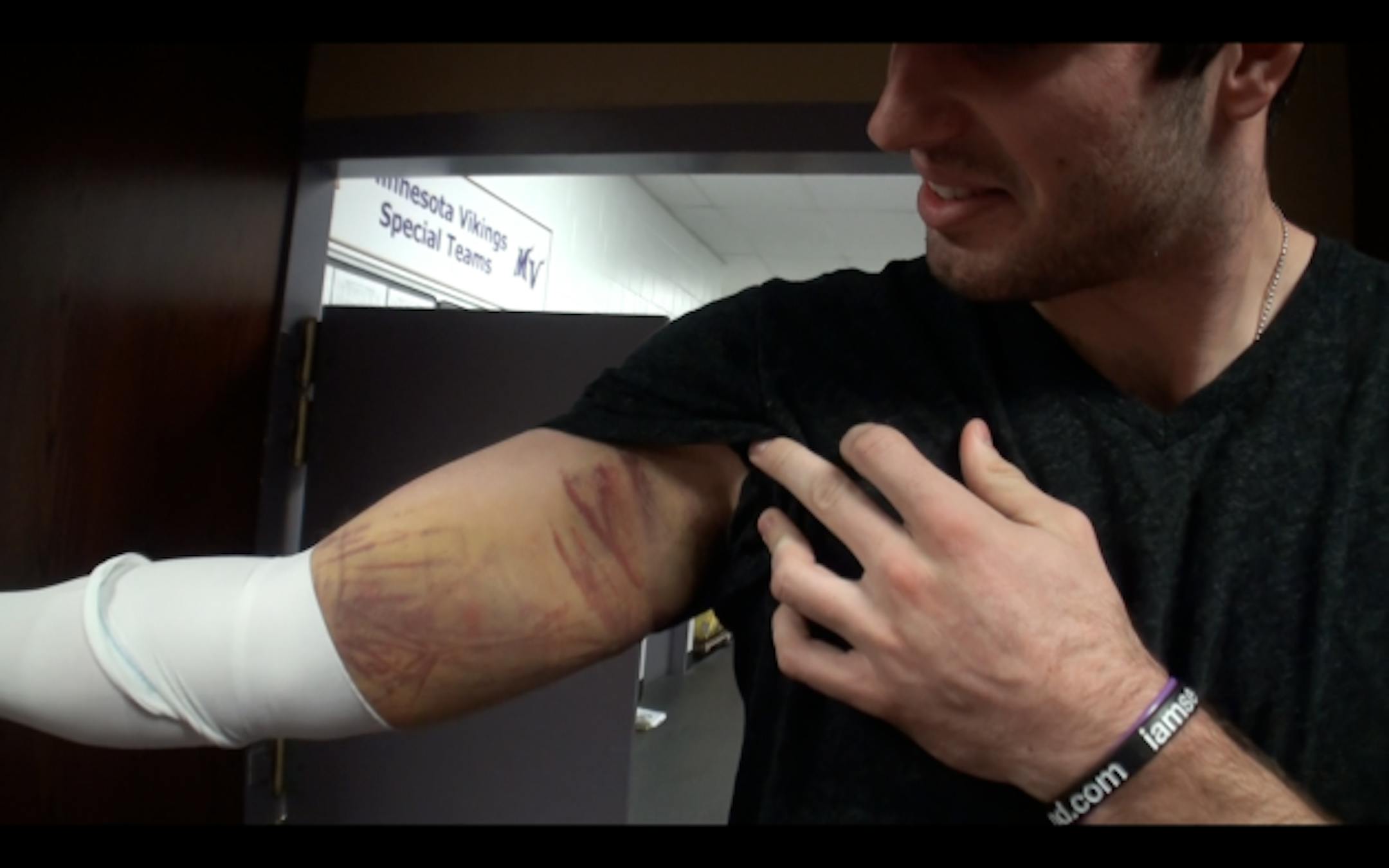 On locker clean out day Monday at Winter Park, Ponder removed a protective sleeve from his right arm to reveal the nasty bruise that sidelined him. Here's what that looked like in a photo from the Star Tribune's Shari Gross.