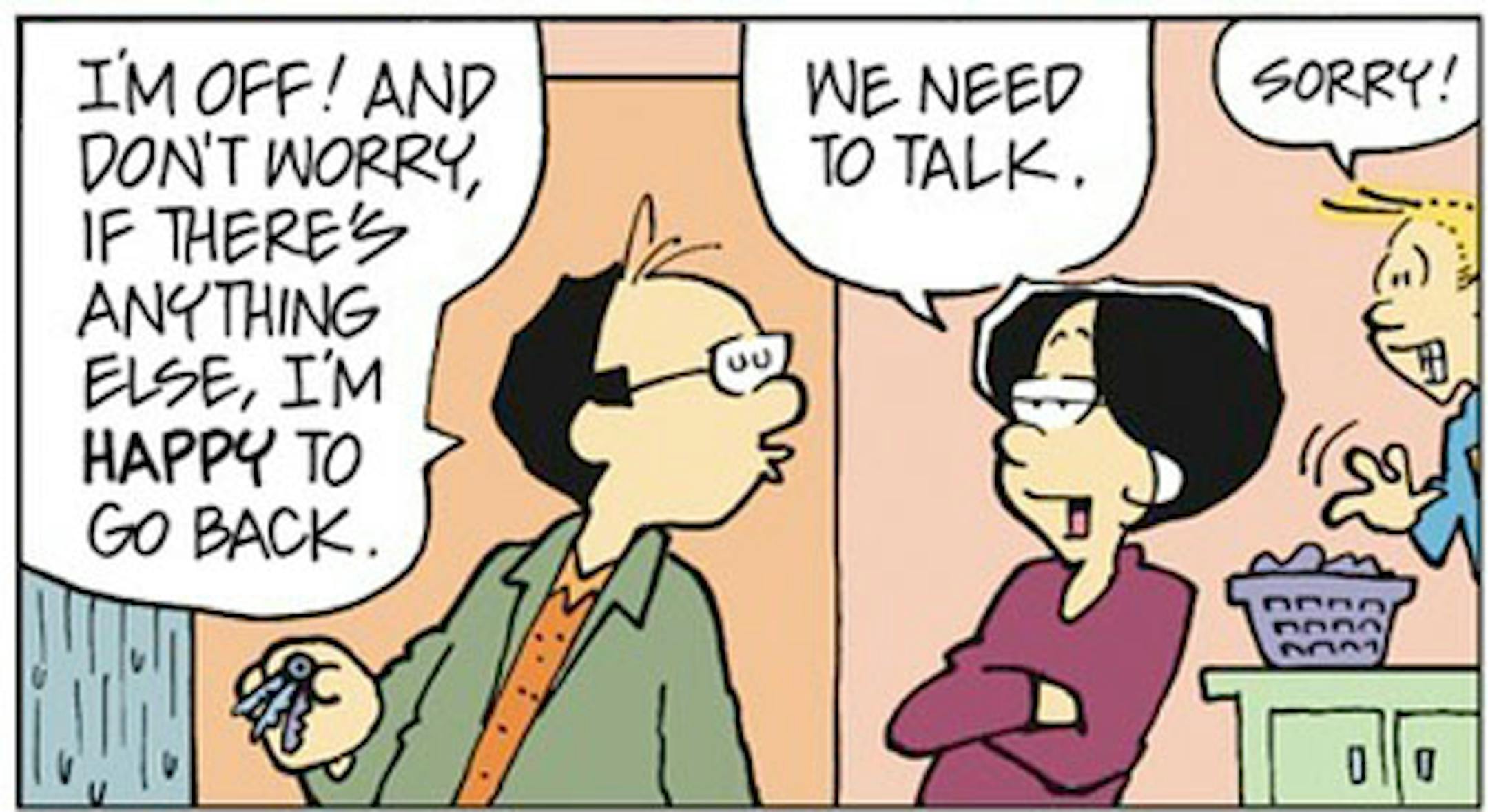 Here's the strip. She says they need to talk because his willingness to go to the hardware store is a result of the taco cart parked nearby. He has not been honest about the taco cart. He has not mentioned the taco cart. Keep in mind that she's sent him to the hardware store three times over the weekend, because she can't fix anything herself. He's still in trouble. They need to have a talk. After which he drives towards the hardware store and considers driving past and just driving as far as he can until he can sort out how his life came to be like this.