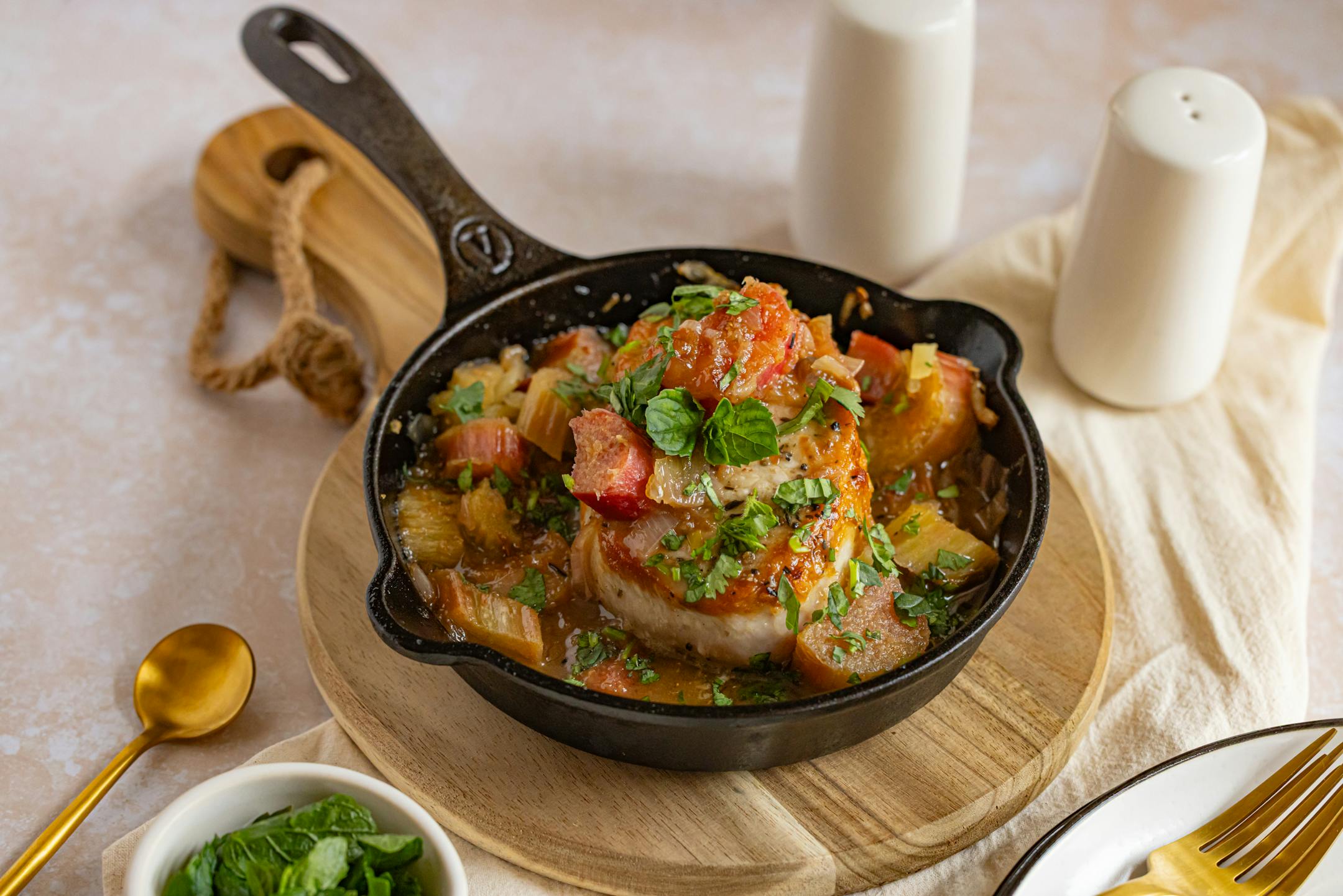 This simple savory rhubarb sauce is equally good on chicken and lamb. Store any extra in a covered container in the refrigerator. Be sure to salt the pork and let it come to room temperature before it hits the pan for tastier, juicier results. From Beth Dooley.