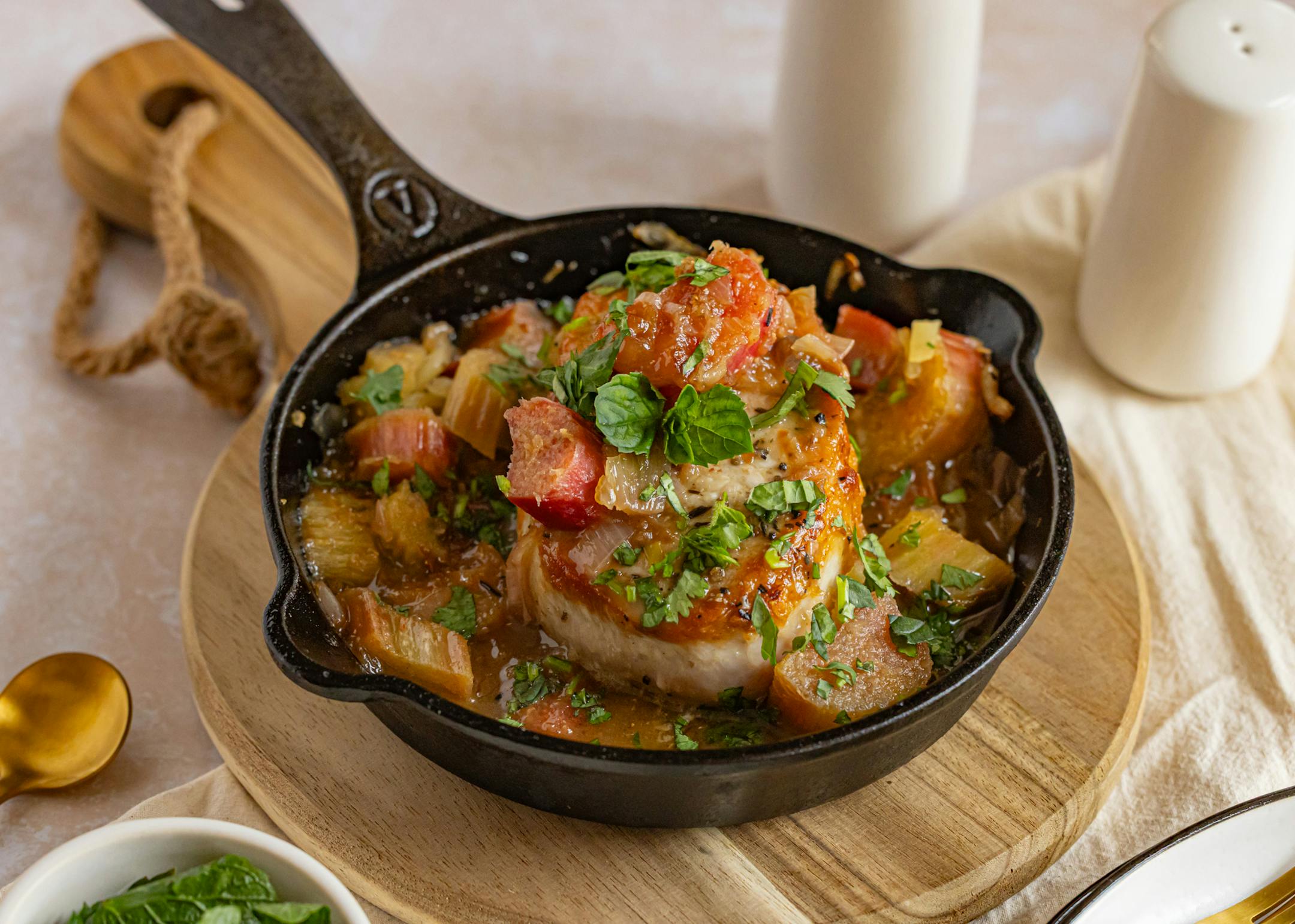 Pan-Roasted Pork Chops in Mustardy Rhubarb Sauce