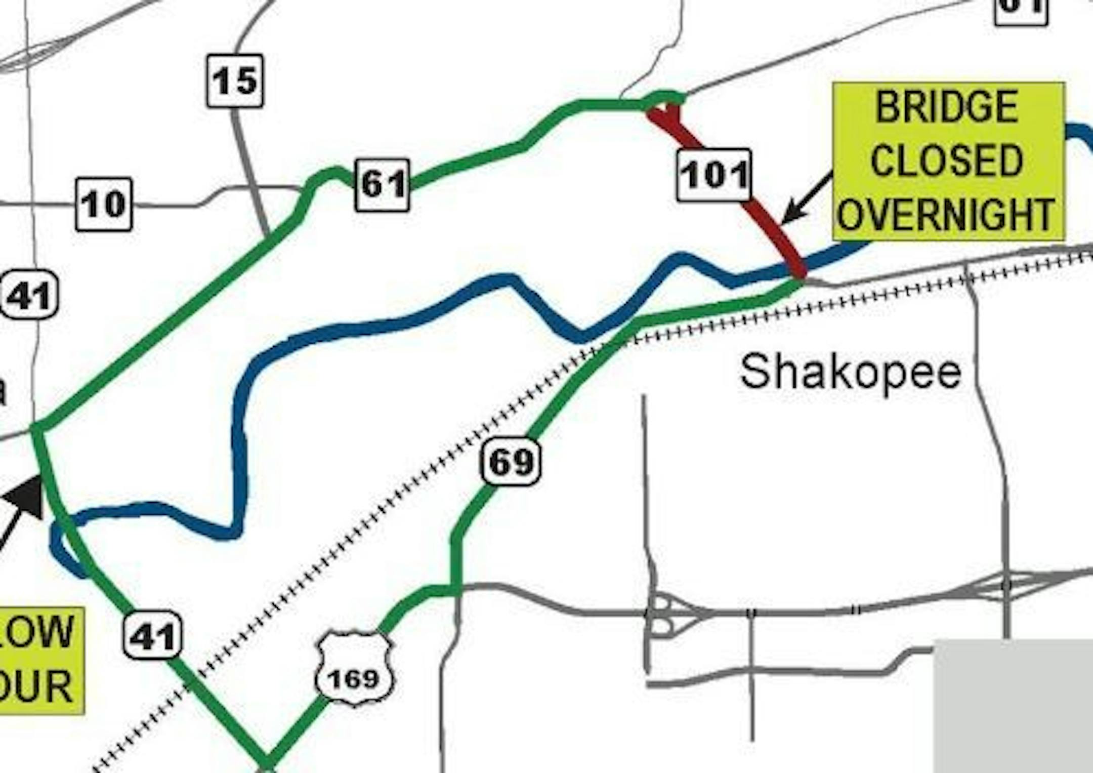 Now for the bad news. The County Road 101 bridge linking Shakopee with Chanhassen will be closed form 6 p.m. Friday until 9 a.m. Saturday as crews pour the new causeway bridge. It's a long detour, Hwy. 169 to Hwy 41 and on County Hwy. 61. Thankfully it is a short closure.