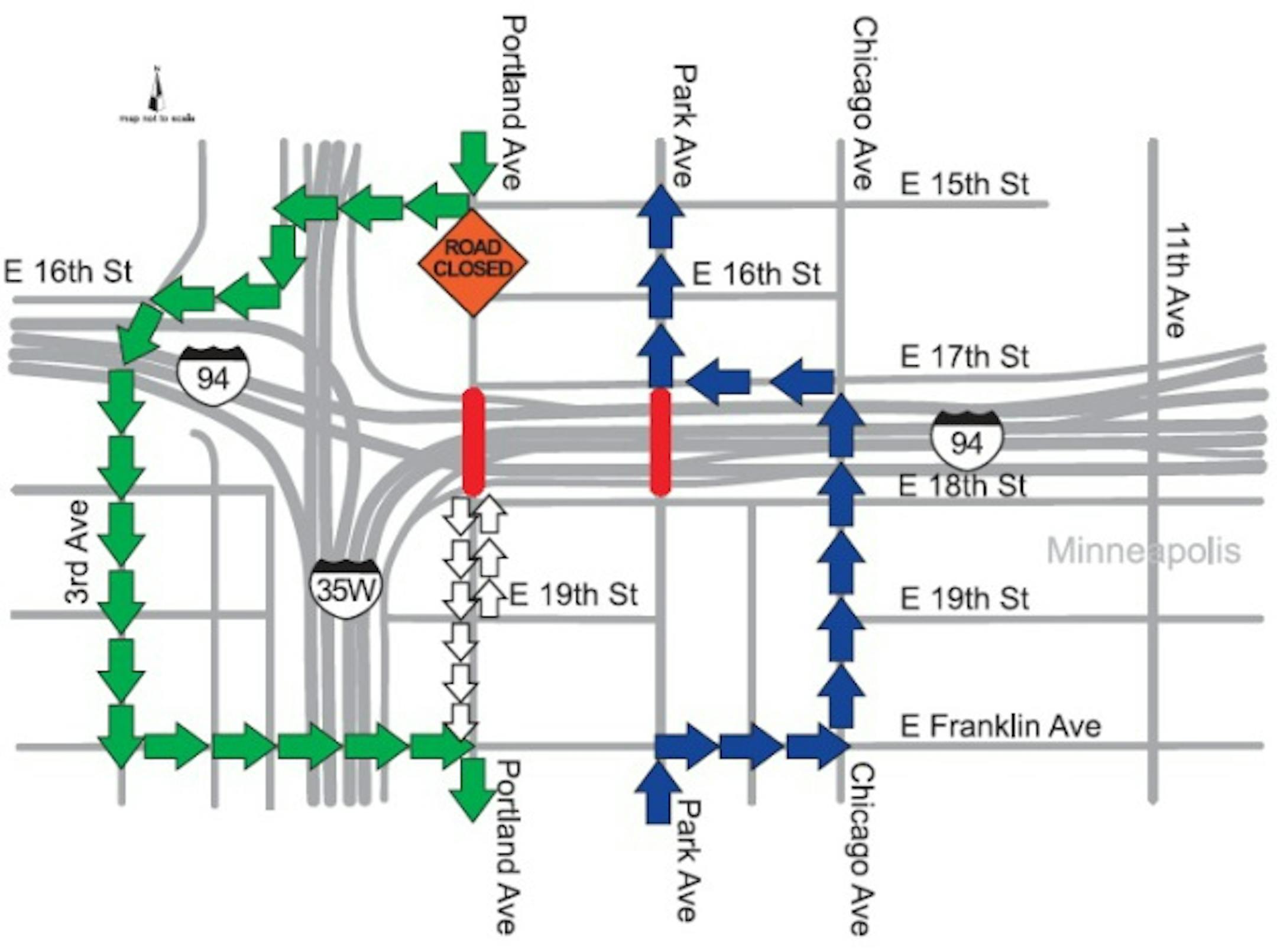 Detour routes (see graphic above) include taking Chicago Avenue from northbound Park Avenue and 3rd Avenue from southbound Portland Avenue.