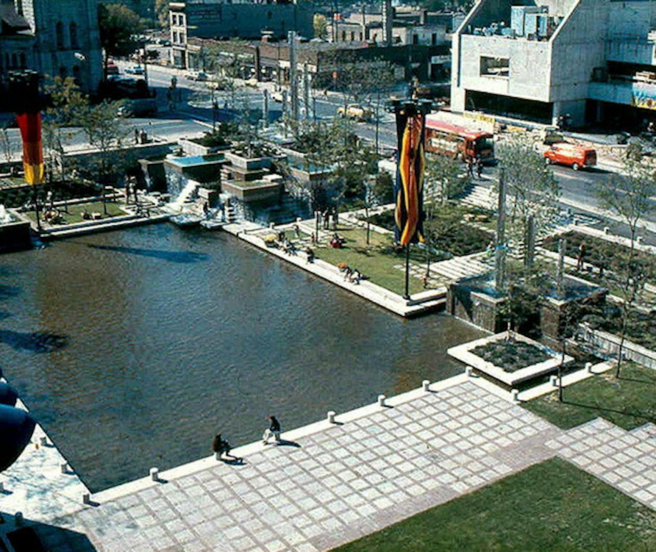 Failing pumps and drains have shut down its cylindrical fountains and transformed the plaza's centerpiece attraction, a large pond, into a permanently dry field of tiles. Once a popular gathering space for its below-ground oasis of water and greenery, now it's mainly a place for downtown workers to sit on the steps and eat lunch.