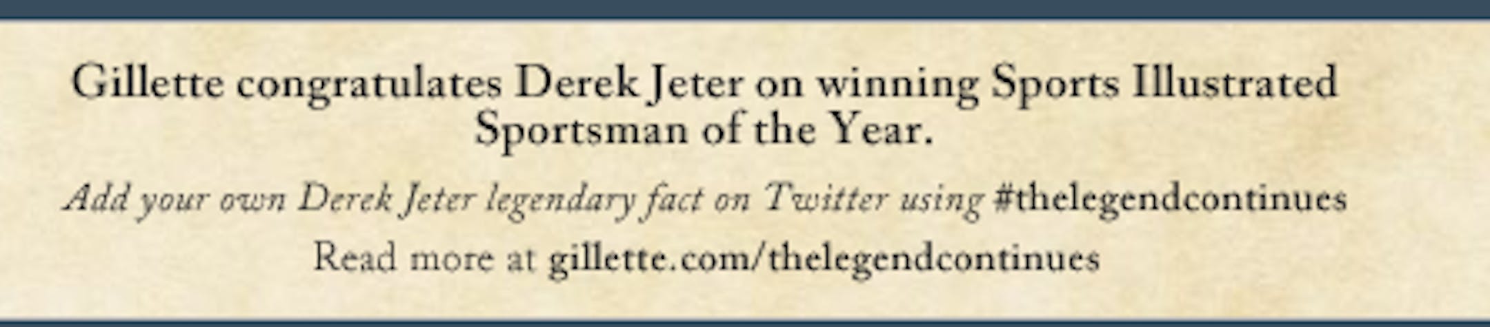 That said, we couldn't help but notice the opportunity for fun that coincided with this award. One of the companies for which Jeter shills, Gillette, is inviting folks to add a "Derek Jeter legendary fact" on Twitter. The best way to collect all of these in one place, of course, is via a hashtag -- in this case #thelegendcontinues.