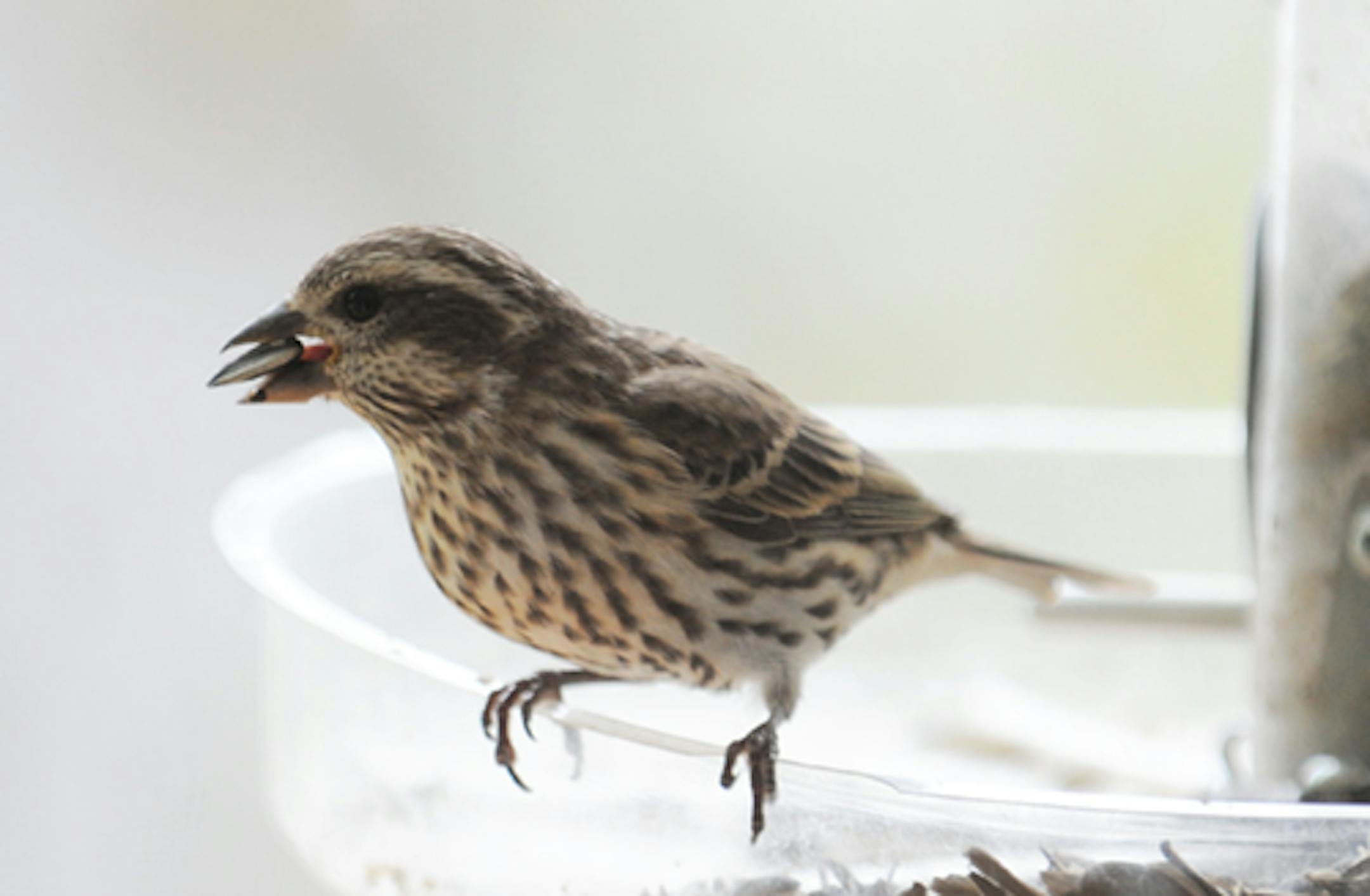 Below is one of the female Purple Finches seen at our window feeders Thursday. The markings on the face of the bird distinguish it from the more common House Finches. Female House Finches have plain, unmarked faces.