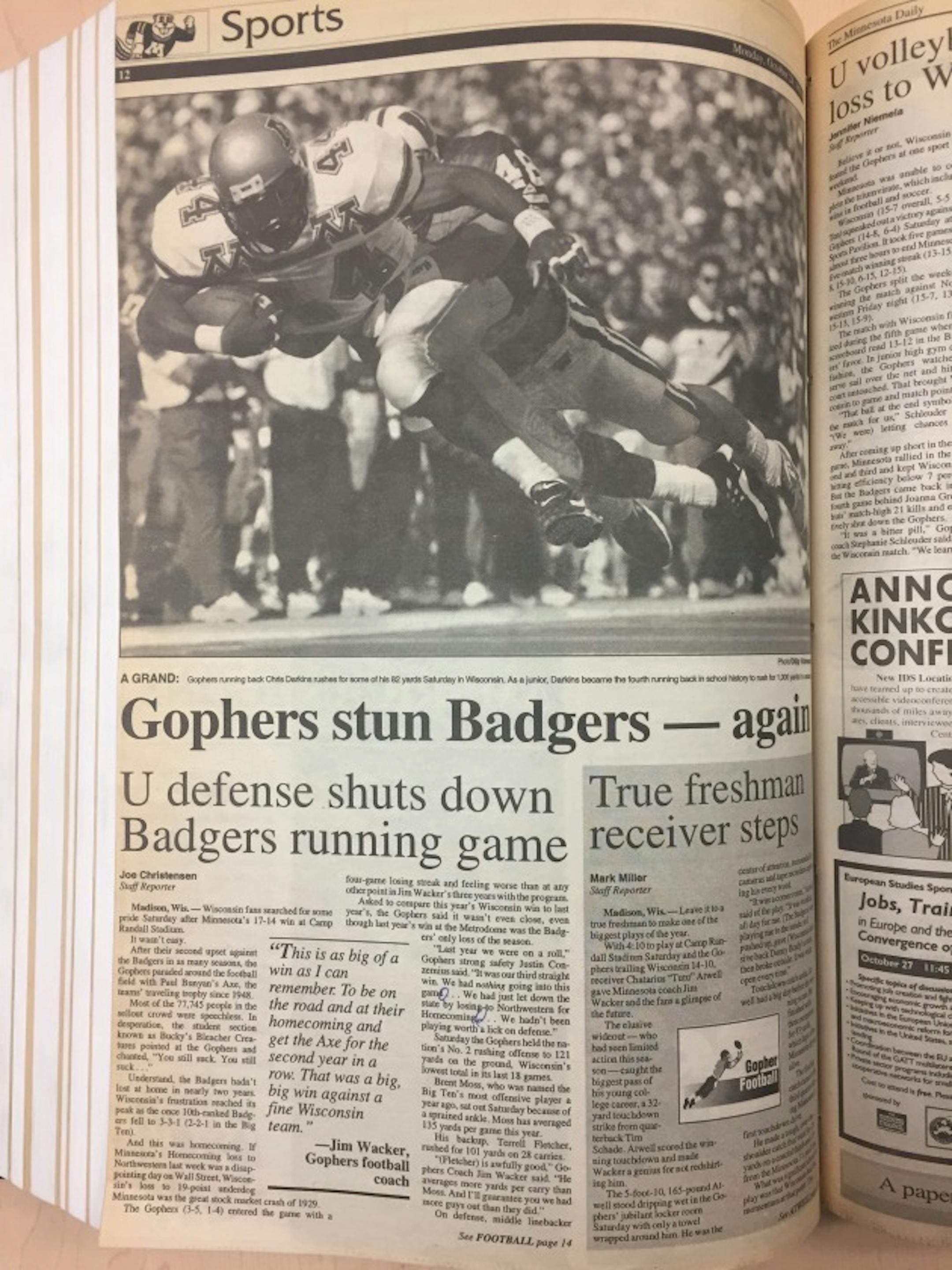 Hard as it is to believe, that was the last time the Gophers won here. We had a good laugh this week, when Mike Hendrickson, the current beat writer for The Daily, found this picture of the coverage from the 1994 win. How about that photo of Chris Darkins by Dilip Vishwanat! And Justin Conzemius was always the go-to guy for postgame quotes.