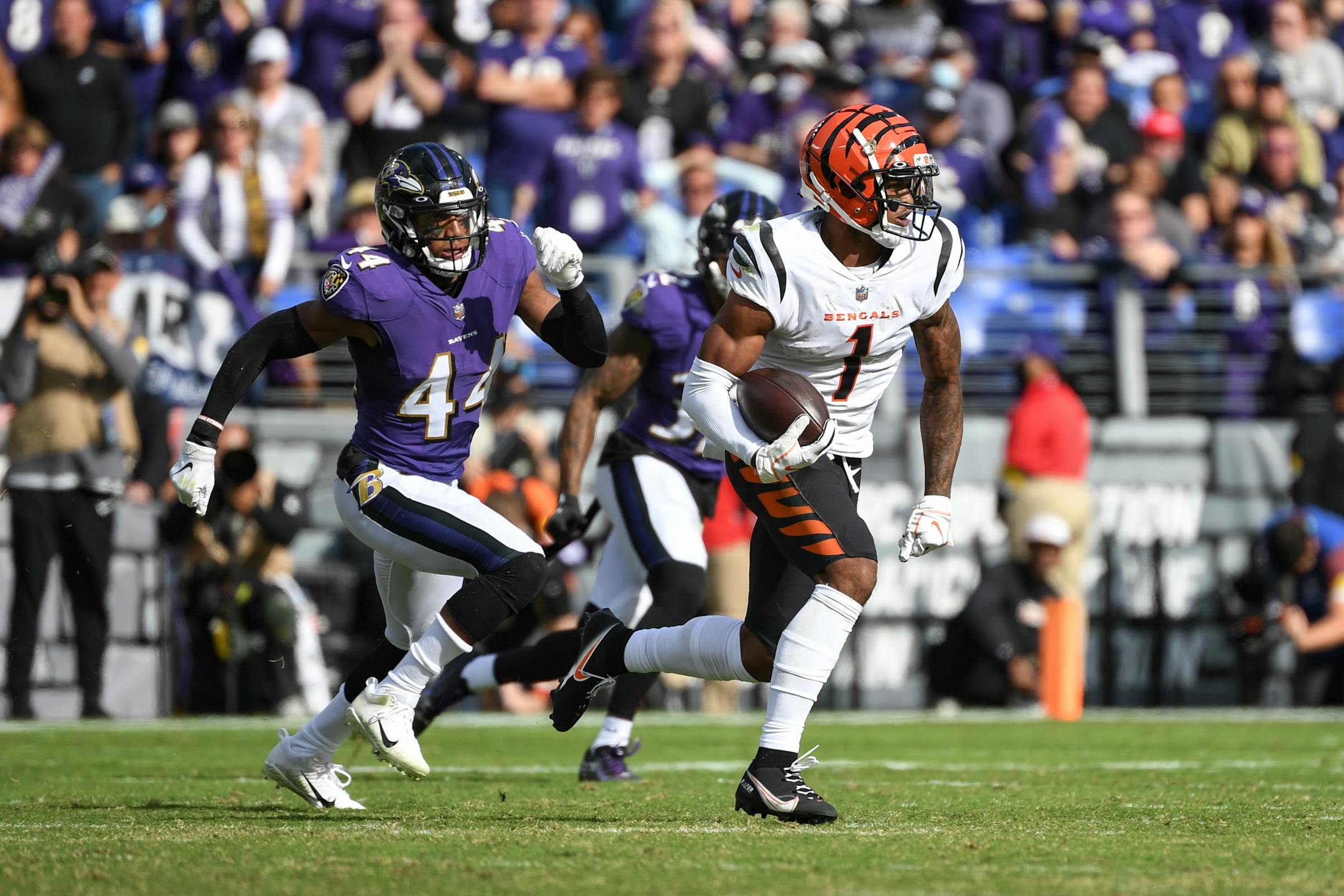 Ja'Marr Chase caught eight passes for 201 yards and a touchdown. Tee Higgins caught seven passes for 62 yards. Tight end C.J. Uzomah caught three passes for 91 yards and two scores.