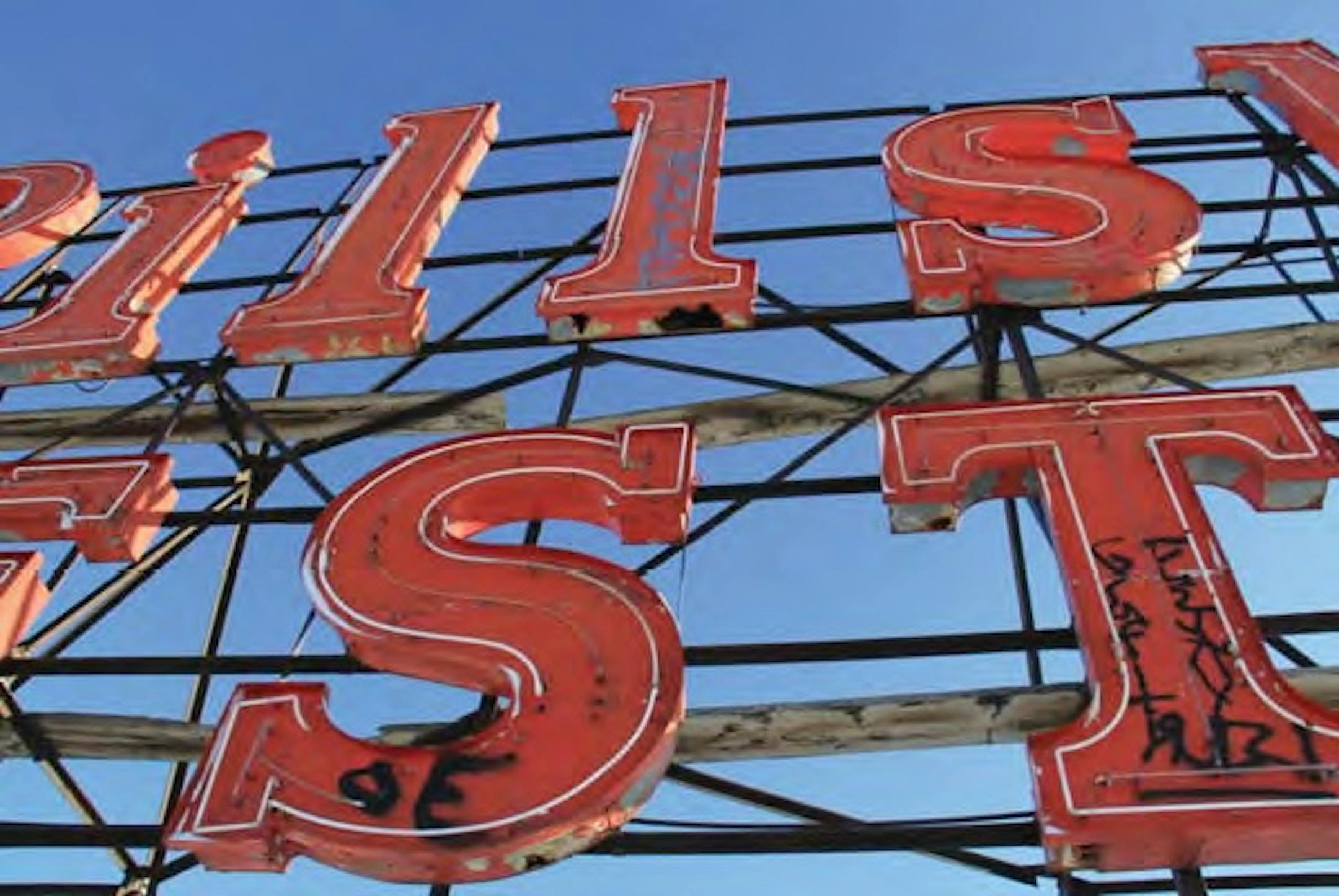 Photos submitted by Lawrence Sign (below) show that there is also graffiti on the existing sign. Shari King with the company added in an interview that much of the existing neon is not working.