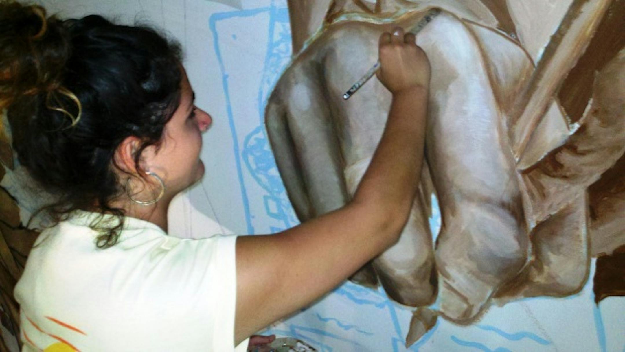 If you're spending your summer indoors, atop a scaffold, your neck bent for hours at a time and your hand sore from gripping a paintbrush, who wouldn't like a little company? So those creating a huge new mural at South High School, 3131 19th Av. S., are encouraging the public to stop by to watch their work. It's the second big mural project at South, covering an entire stairwell, as its predecessor in another stairwell did six years earlier. This 1,700-square-foot version tries to encapsulate seven constitutional principles in a way that represents their views on what democracy looks like from south Minneapolis in the 21st century. The project employs three professional muralists, Gustavo Lira, Shannon McEvoy and South alumna Greta McLain, who oversee the work of two dozen South students who are giving up good chunks of their summers to paint for six hours a day. "They're in all the way," said South art teacher Denny Sponsler, the glue binding the project. "This is their mural and they know it."