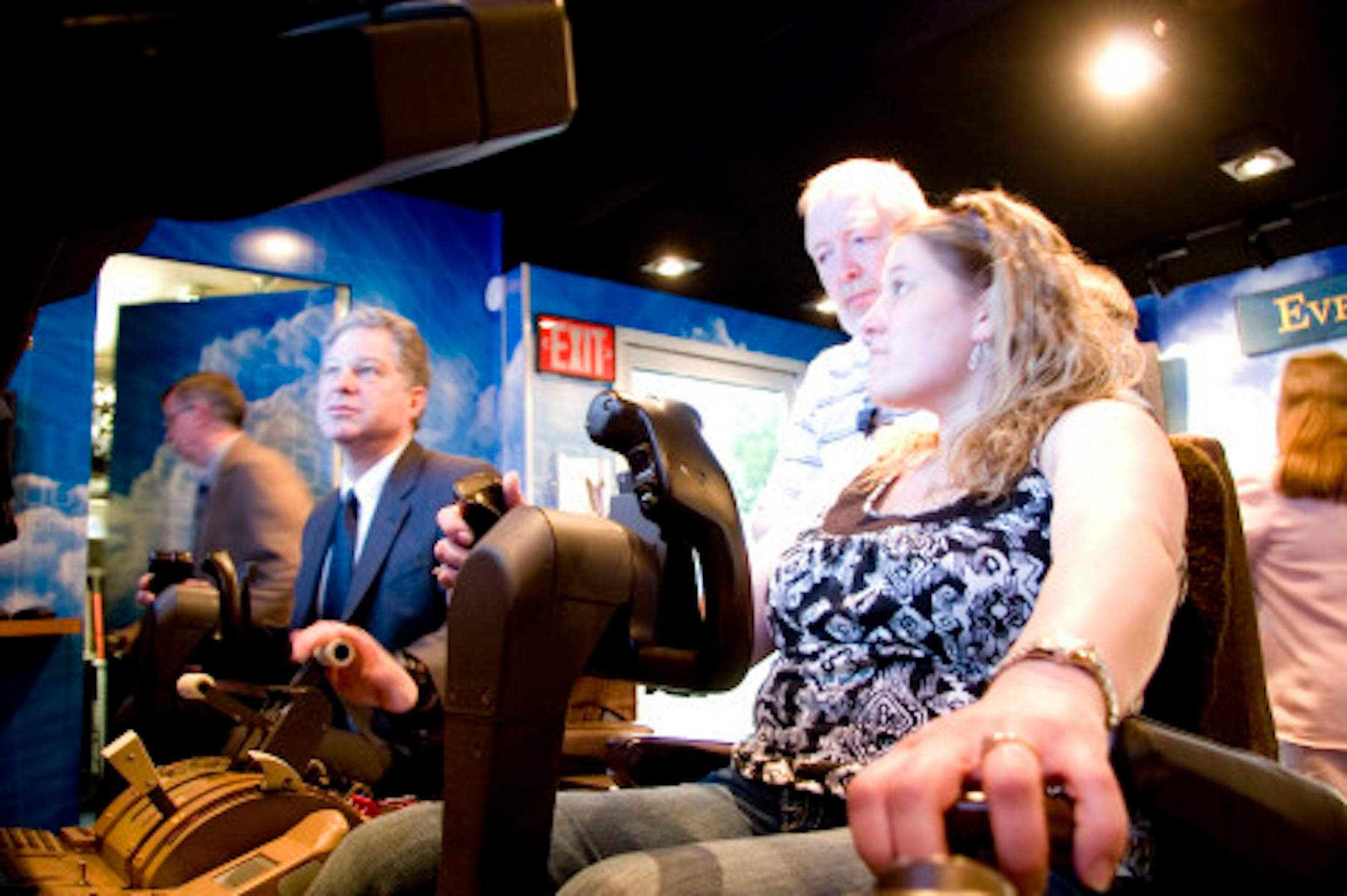 Former Air Force boom operator Trisha Carlson, of Eagan, took controls of the simulated Boeing 767 aircraft. Assisting her is Boeing executive Glenn Handy.