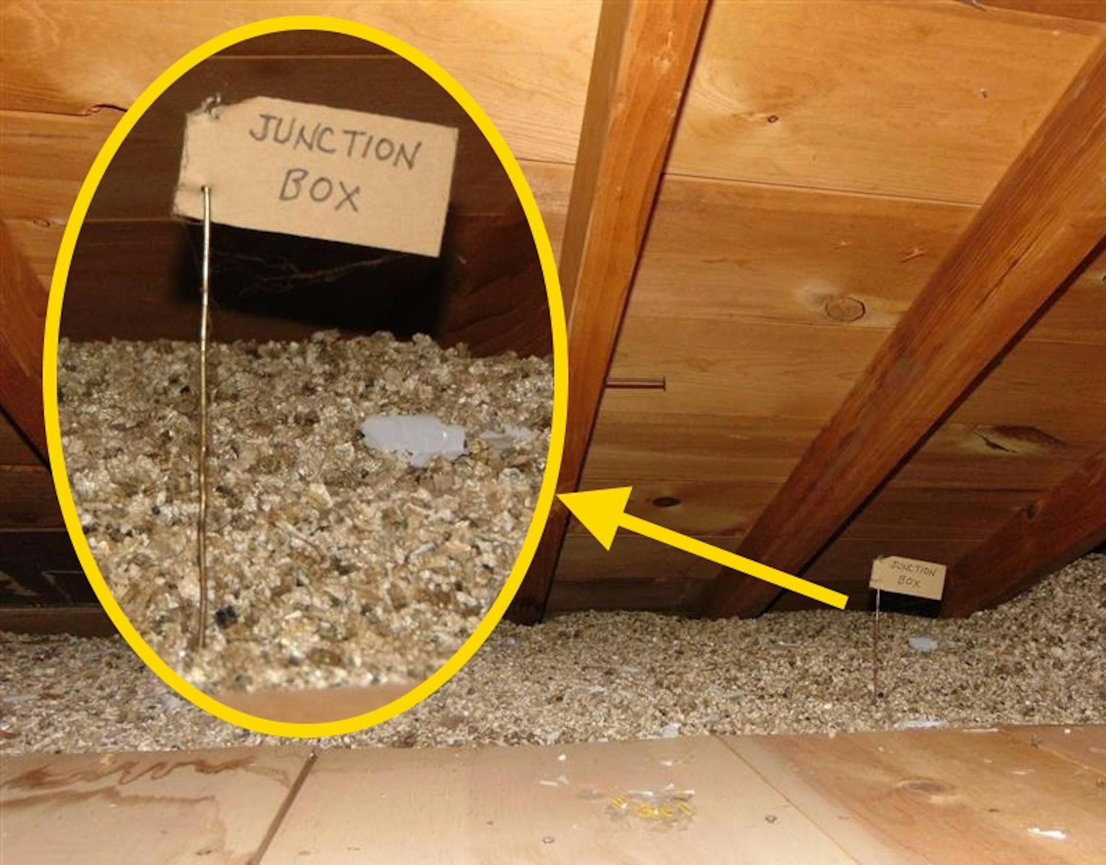 This question came up during a conversation with another home inspector at the last ASHI chapter meeting. We know that the covers for electrical boxes need to be accessible, but what if the box is located in an attic? Is it acceptable to bury the box in insulation? I said I'd research the topic and get back to him, but I also thought it would make a good topic for a blog post. Also, I happened across a great photo of a junction box buried by vermiculite insulation while looking through old photos for last week's blog post on vermiculite insulation.