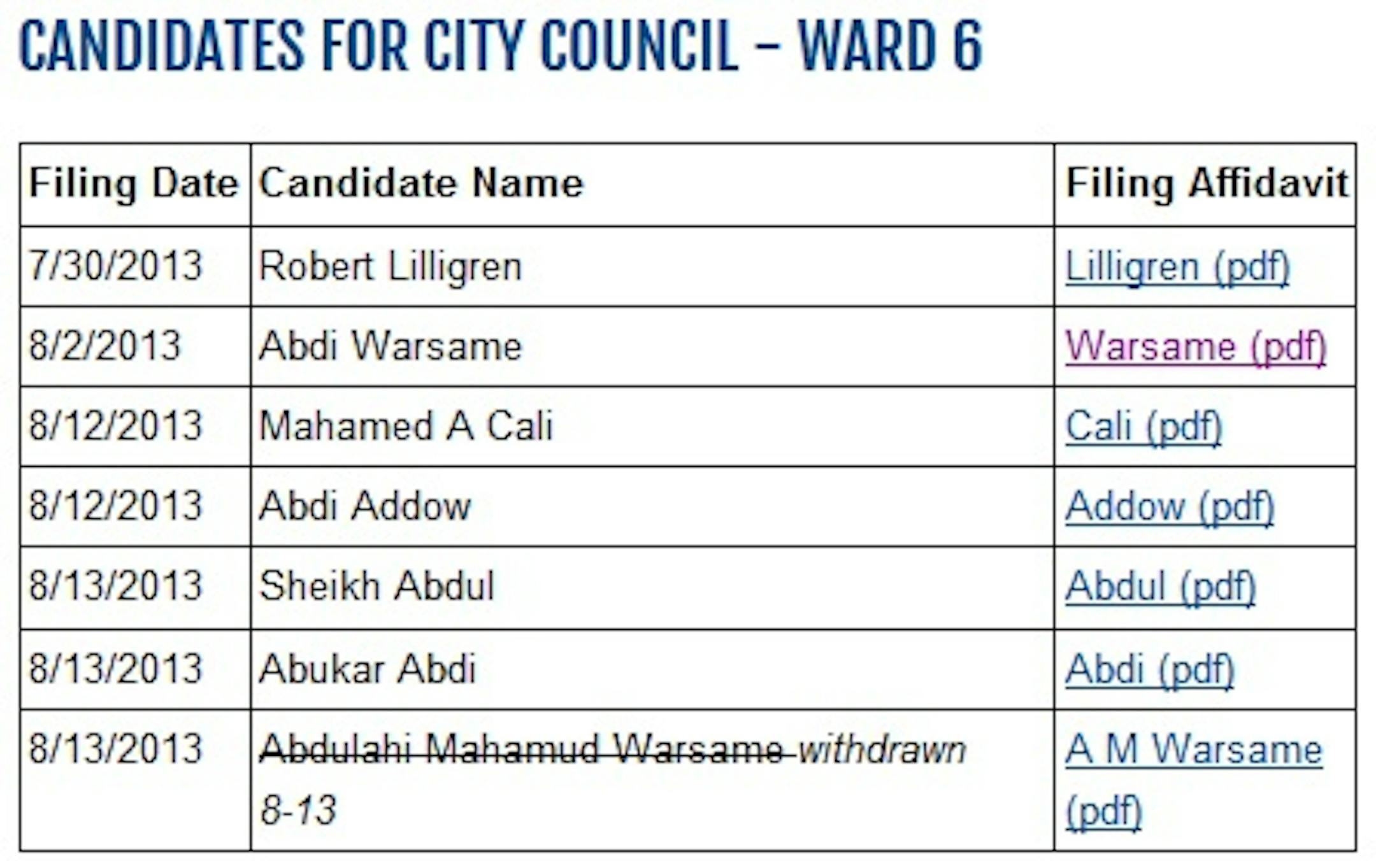 Abdulahi Mahamud Warsame paused at length when repeatedly asked why he had gone down to City Hall to file for candidacy. He said he filled out the form, realized other candidates had similar names, and "I thought that would be confusing." He said he told them immediately he was dropping out and that the whole matter took 15 minutes, though the webpage did not update to show his withdrawal until later this morning.