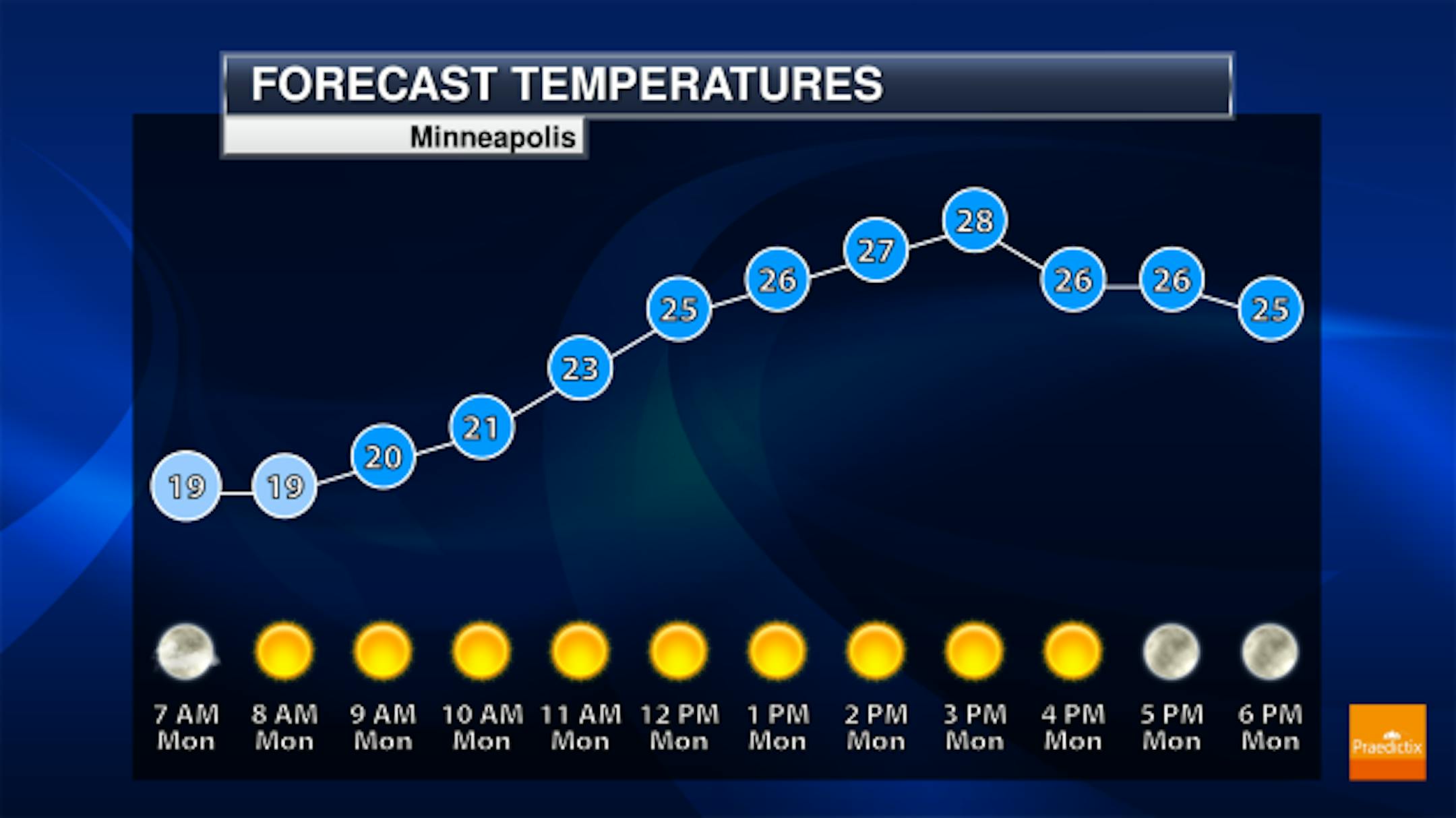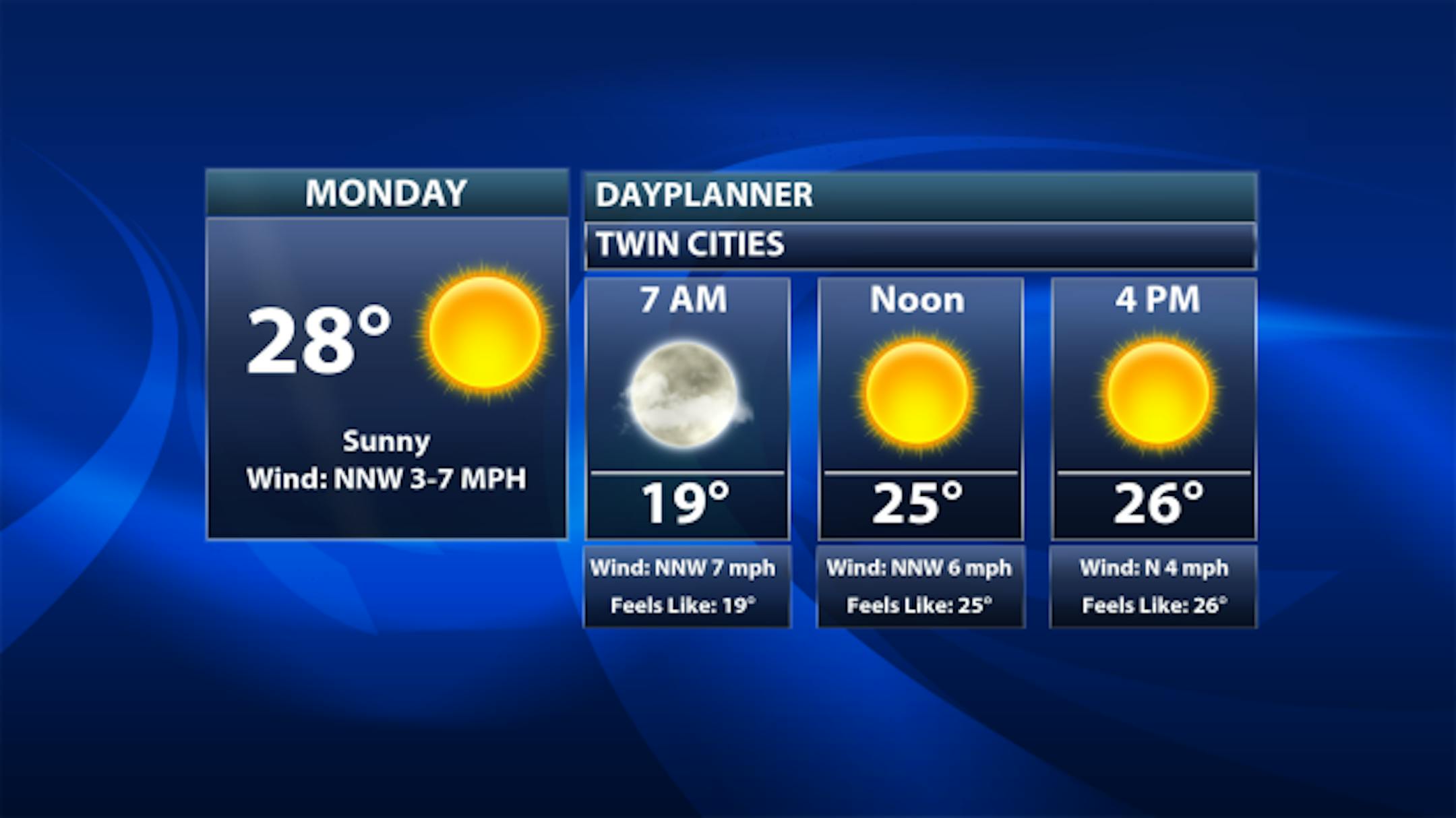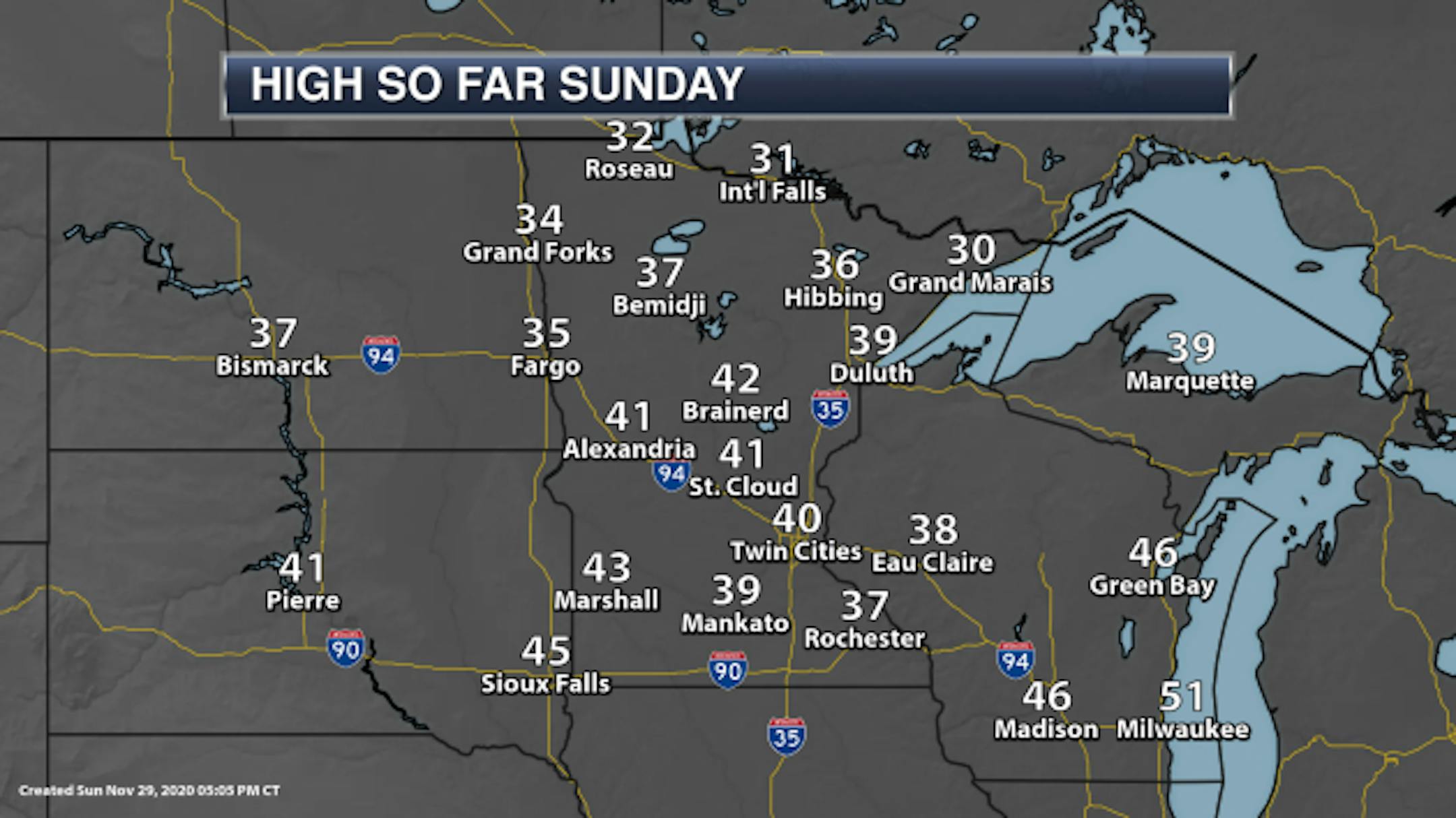 Sunday wasn't quite as nice with much cooler temperatures in place - in fact, our high was set early this morning in the Twin Cities.
