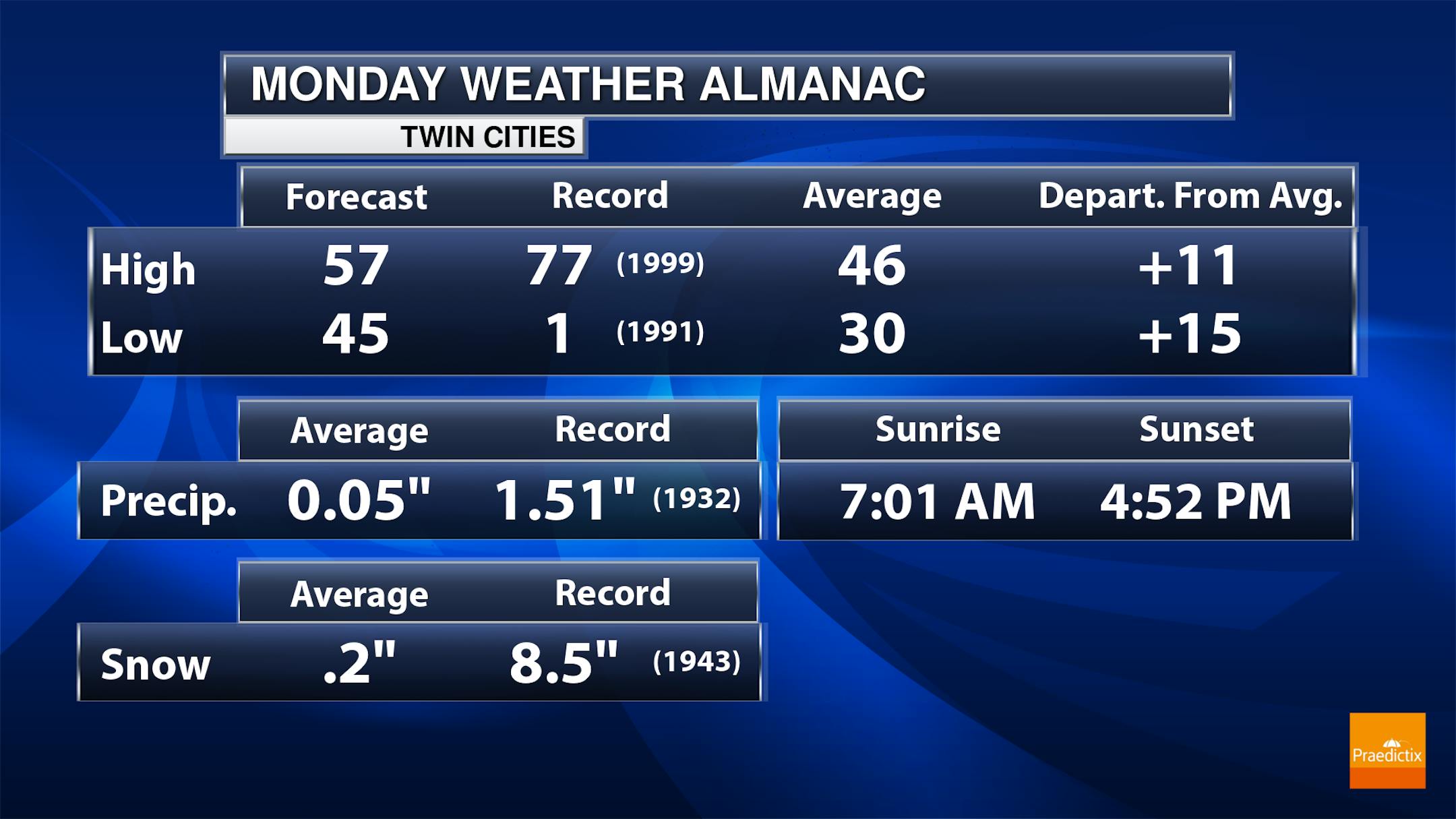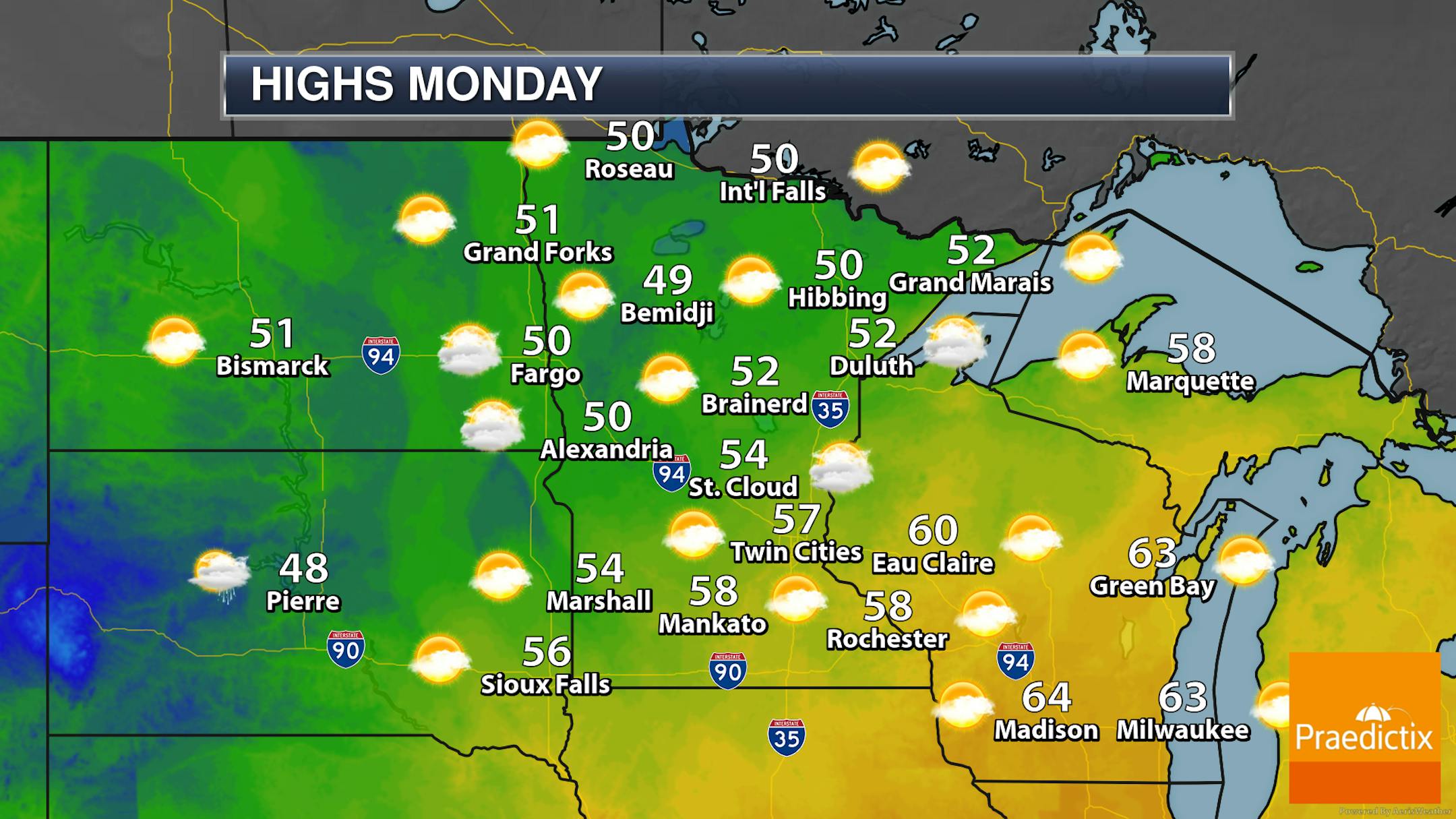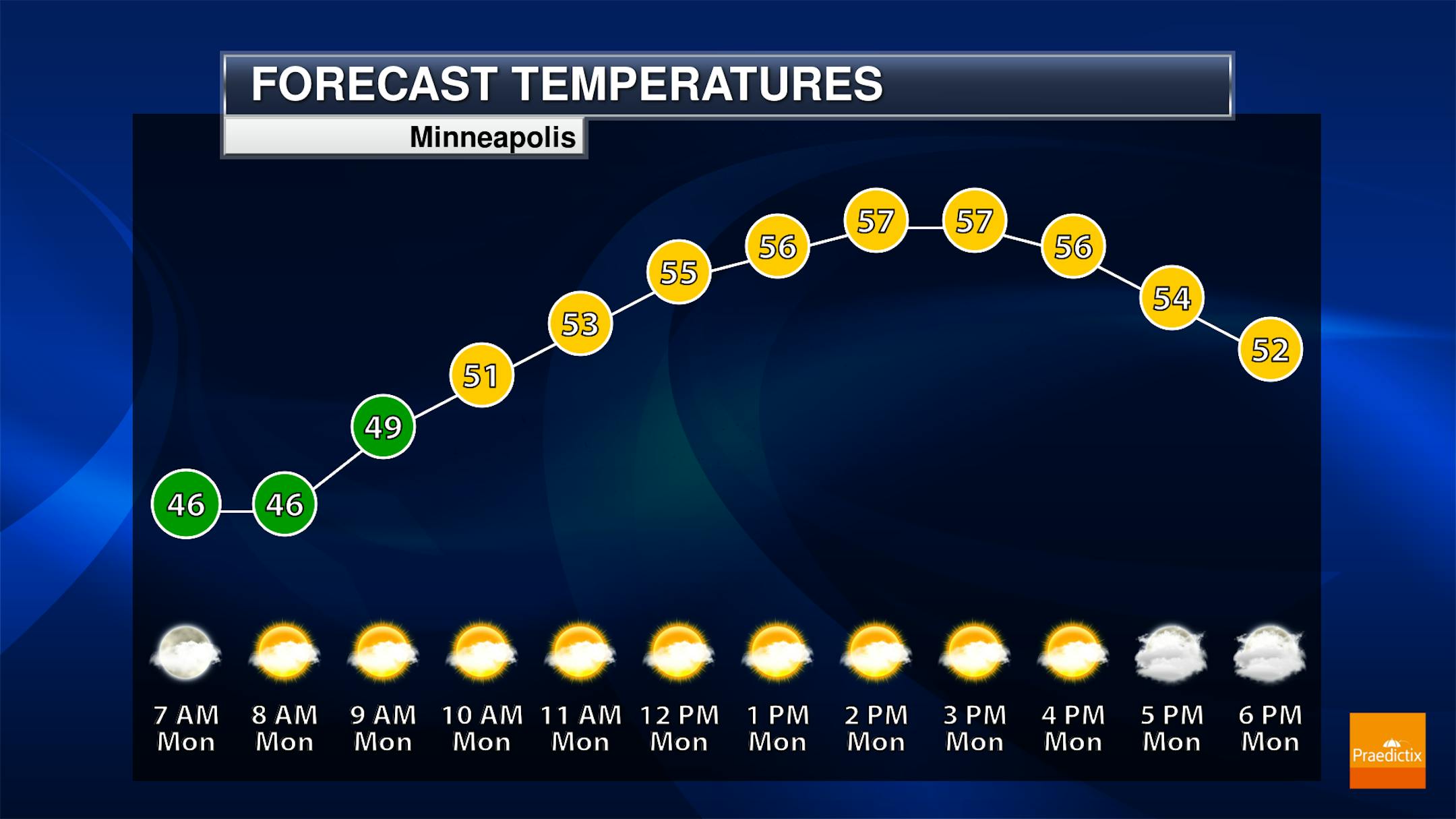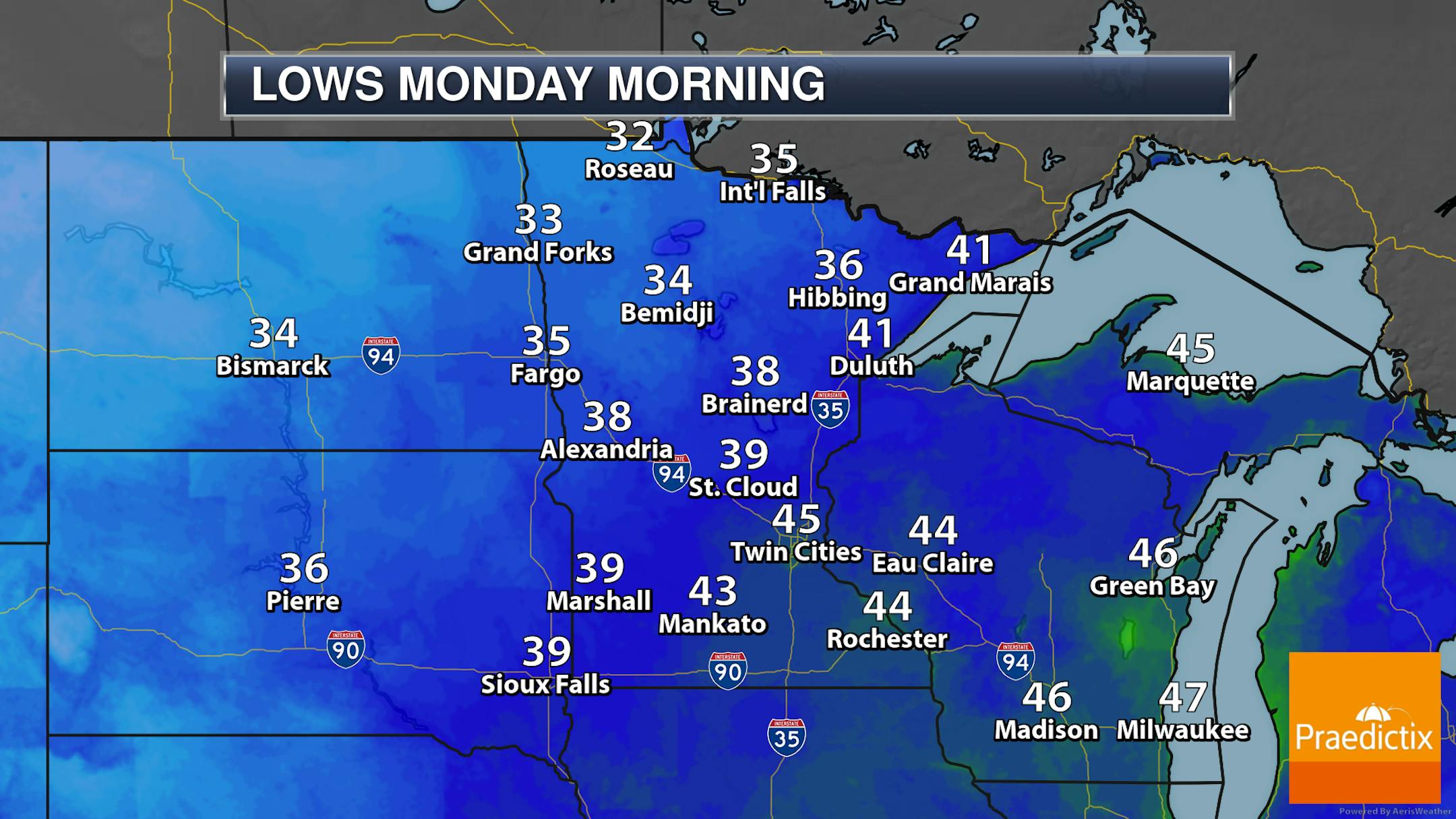 Across the state on Monday temperatures will mainly start off in the 30s, but 40s will be possible in south-central and southeastern portions of the state, including the metro, and along the North Shore.