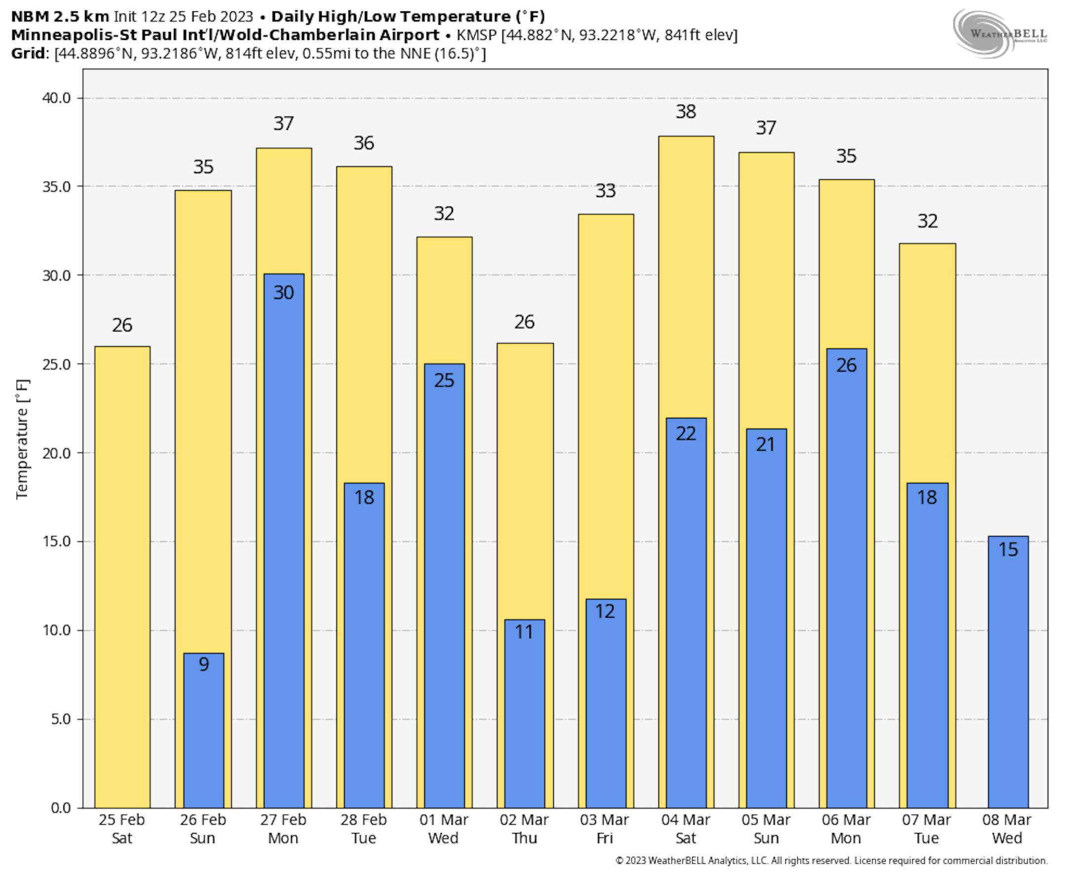 Conditions are expected to be quiet as we head through the last Sunday of February here in the Twin Cities. Mainly sunny skies are expected, but clouds will start to increase late in the day ahead of a system Sunday Night into Monday. Morning temperatures start off in the upper single digits with highs climbing to the mid-30s.