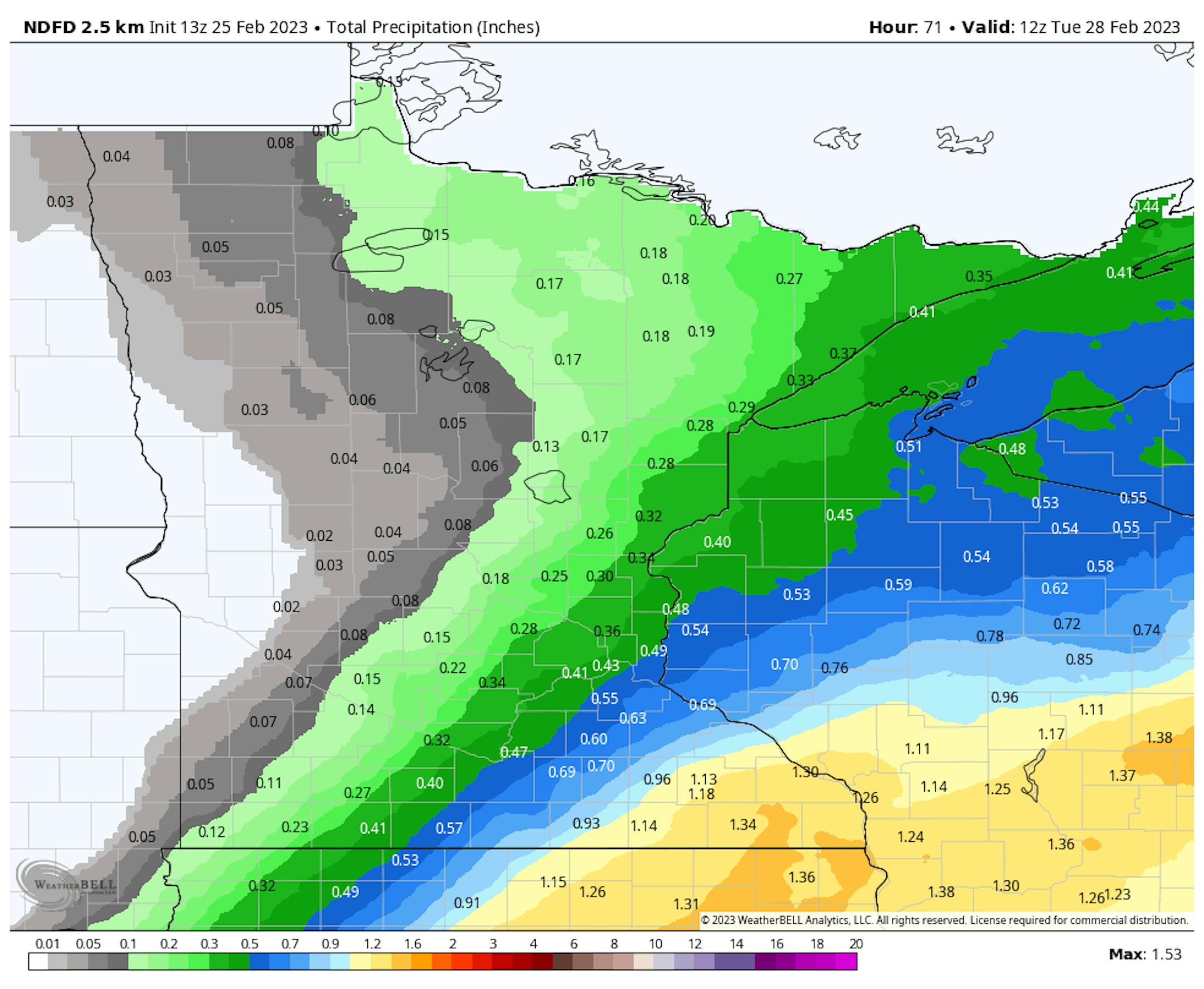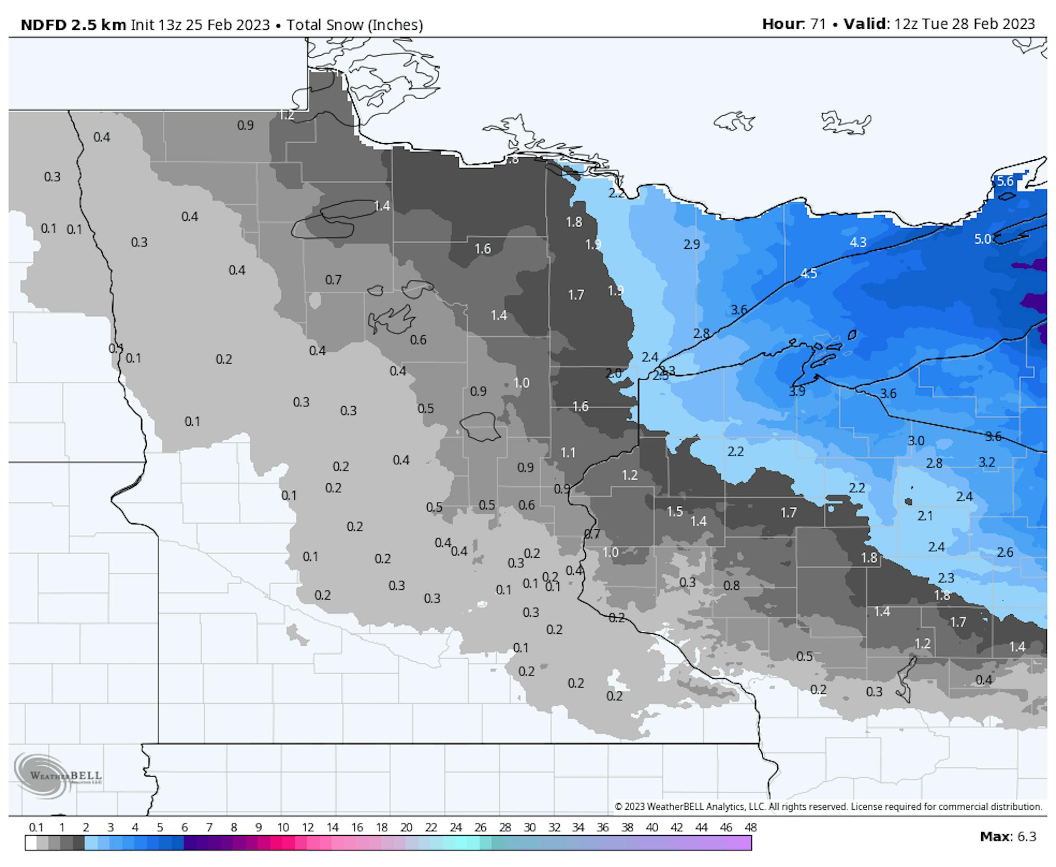 While precipitation ends as some light snow in the metro with under a half inch expected, heavier snow amounts can be expected across the Arrowhead with up to 5" possible the farther up the North Shore you go.