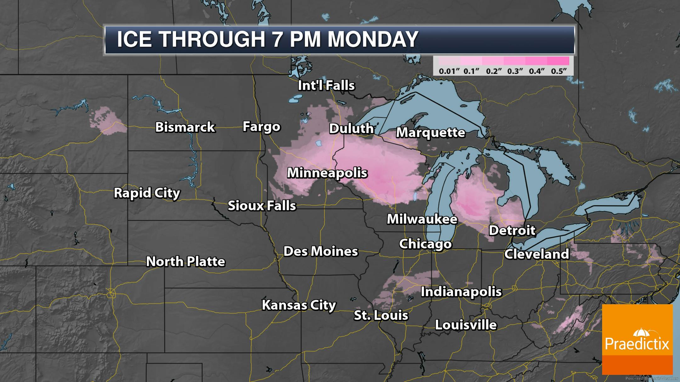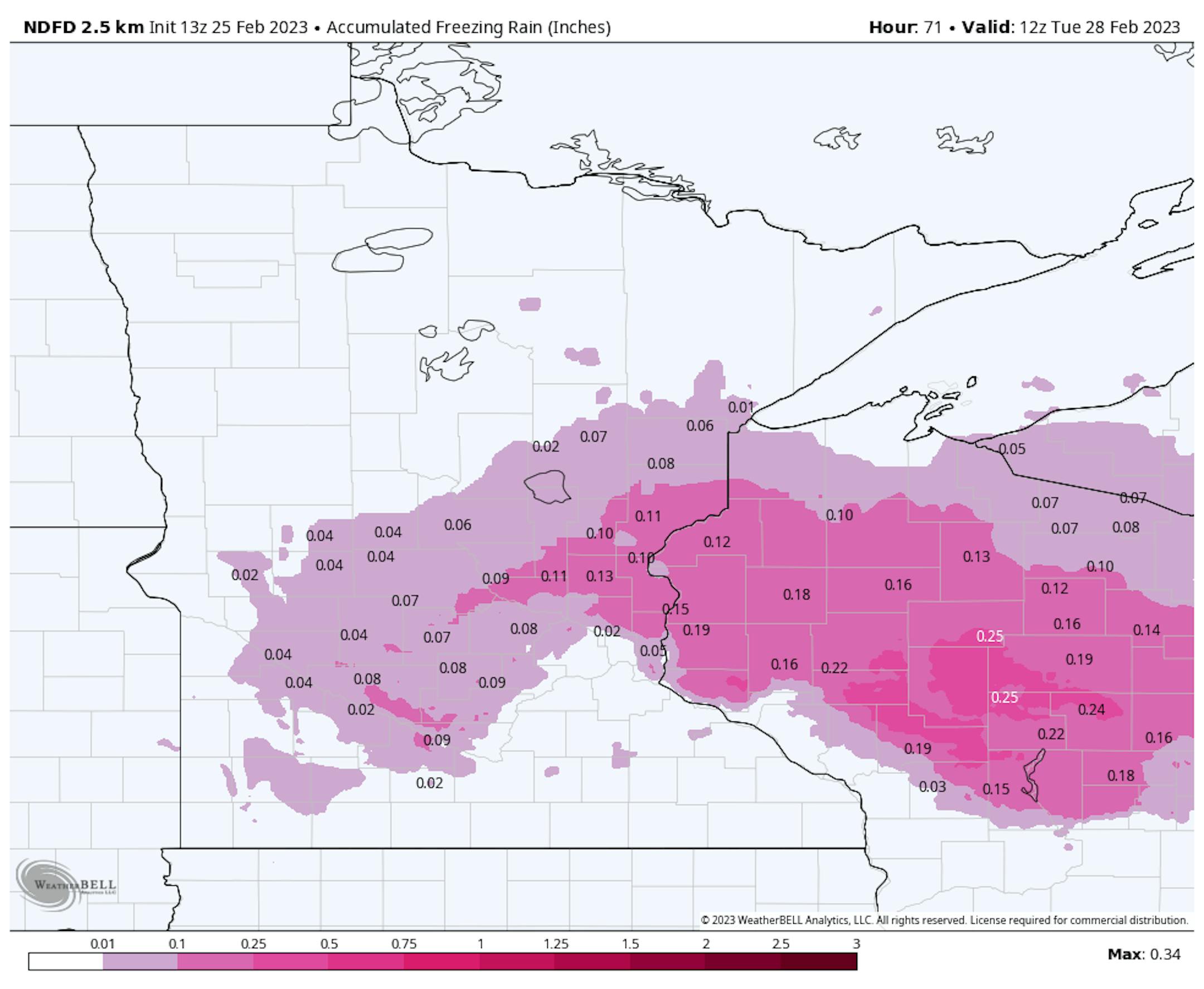We could see a glazing of ice here in the metro Sunday Night before the precipitation changes over to rain, but higher icing amounts (0.1" to 0.15") will be possible north of the metro including areas like St. Cloud and Hinckley. Even greater amounts of icing (up to 0.25") will be possible in parts of Wisconsin. This has the potential to lead to slick roads across the region - especially for the Monday morning commute.