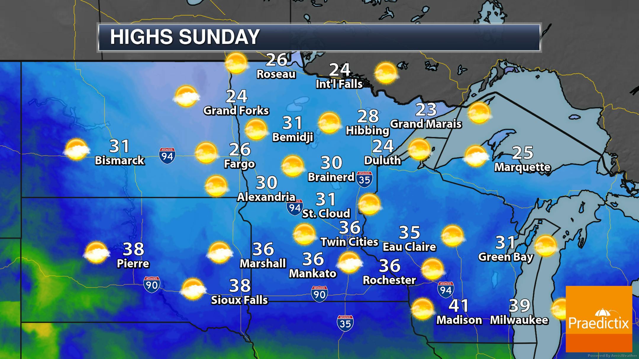 Highs in the 20s and 30s are expected across the state on Sunday with most areas seeing mainly sunny skies. Clouds start to increase late in the day, however, across southern Minnesota.