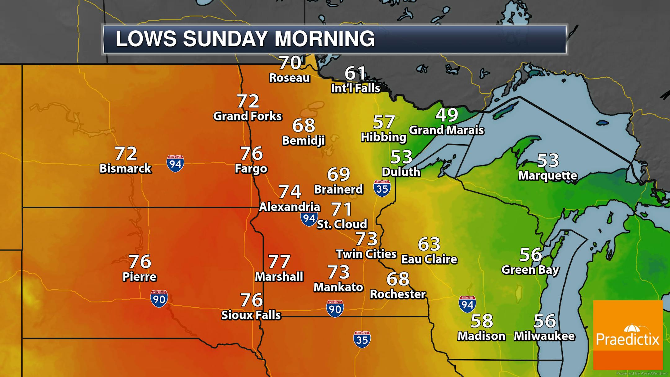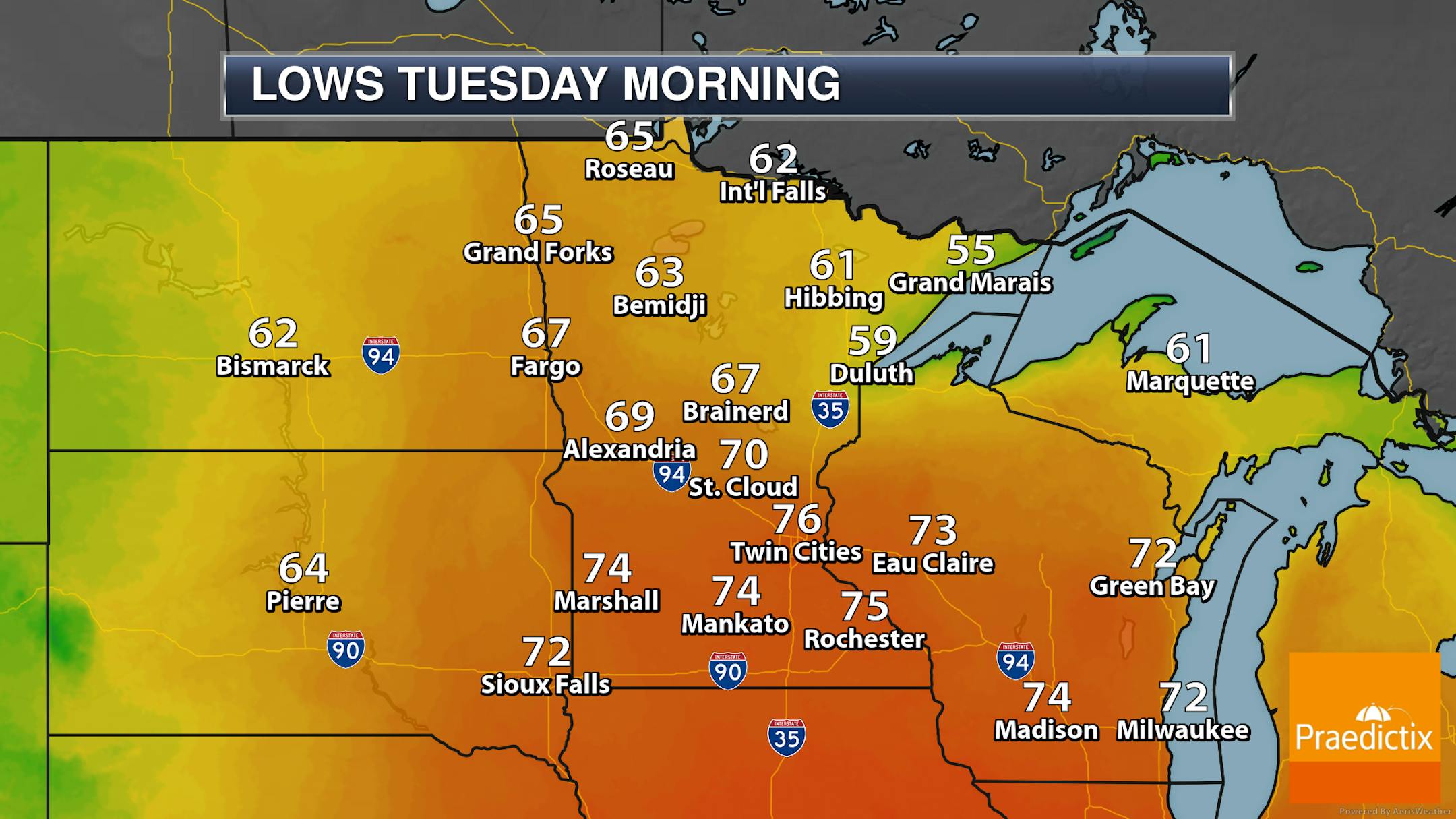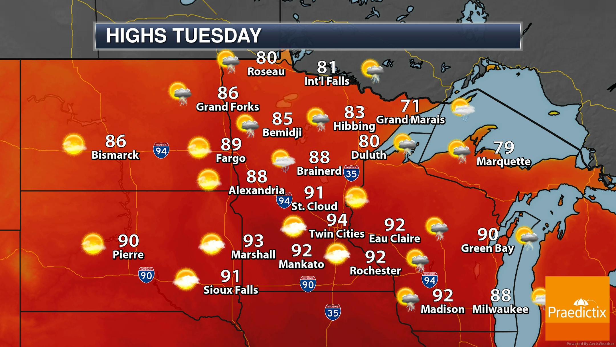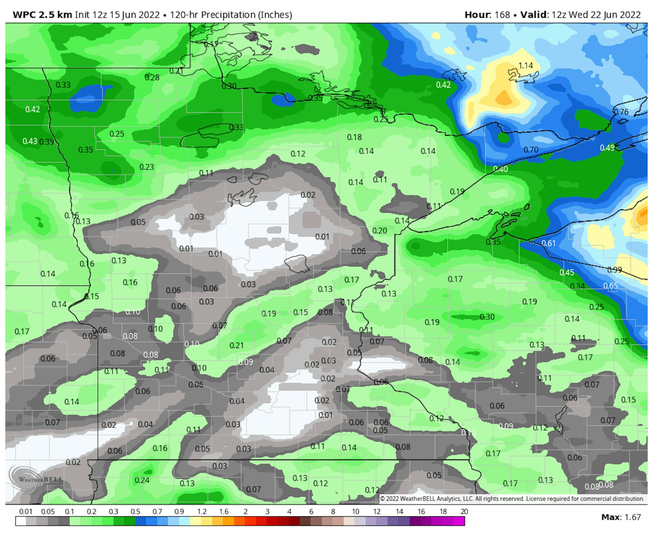 Across northern Minnesota, we will watch the chance of an isolated shower or storm mainly in the morning hours. Otherwise mainly quiet weather is expected (besides those breezy conditions) with highs in the 70s in northern Minnesota and 80s across southern parts of the state.