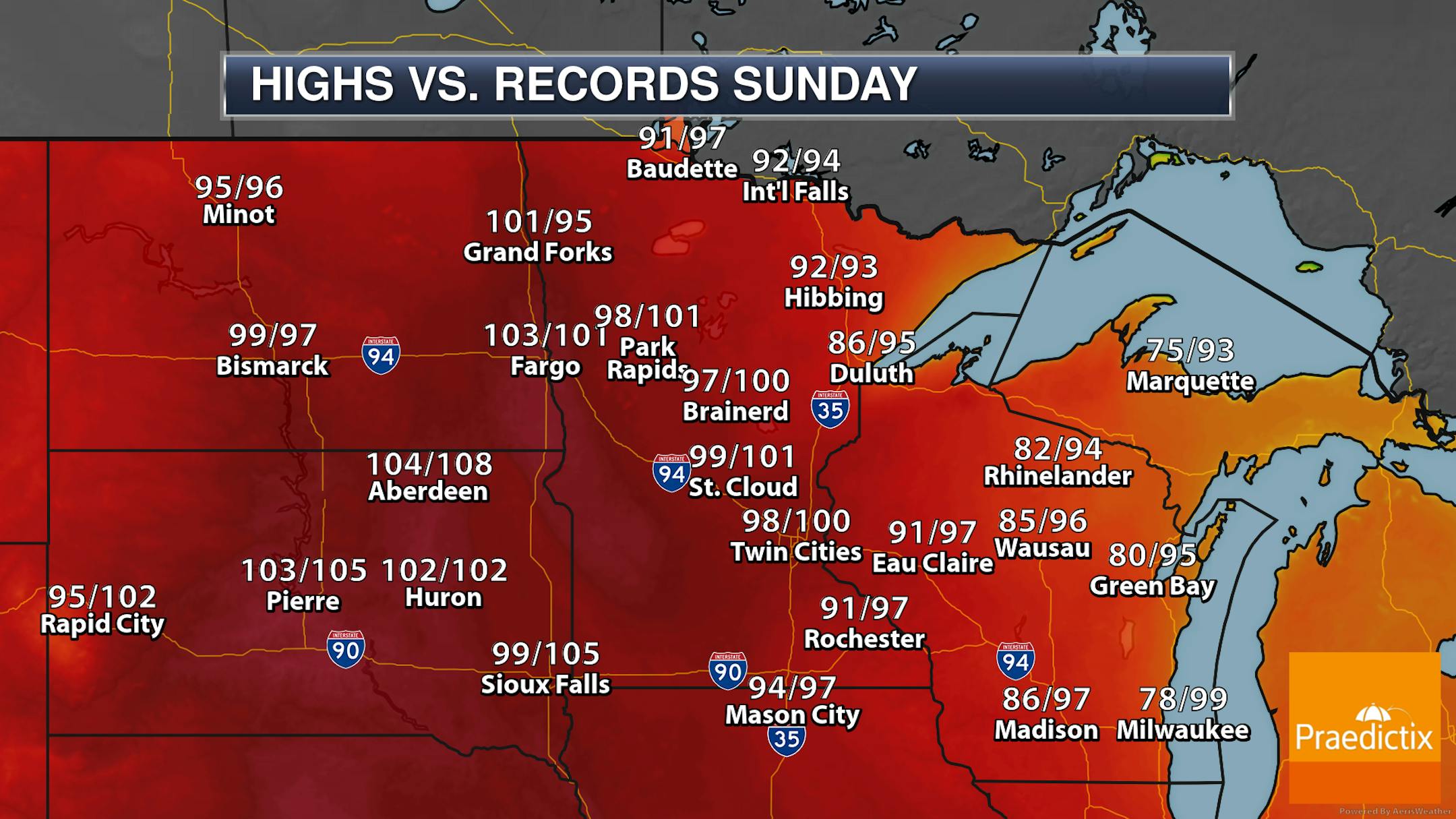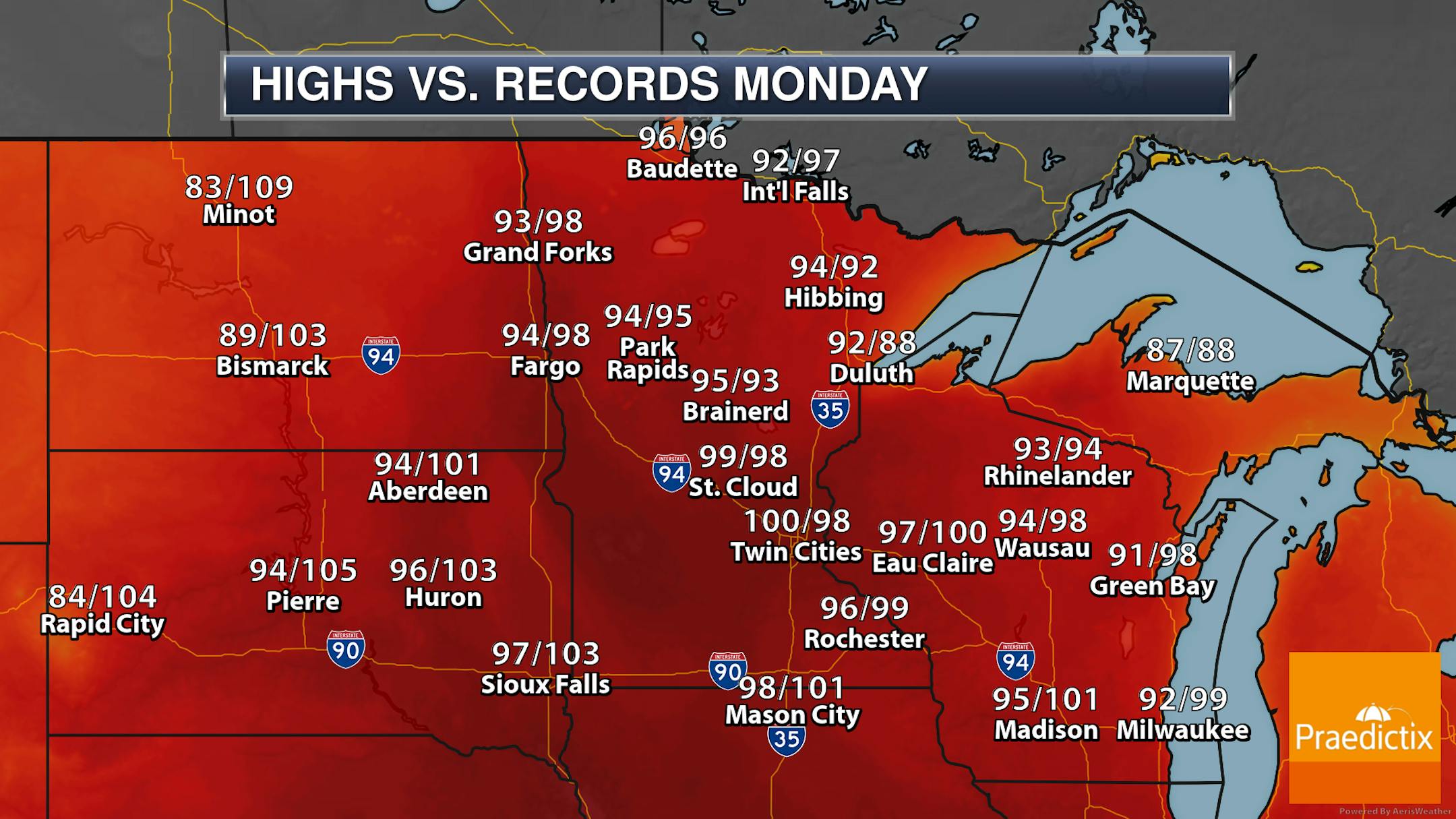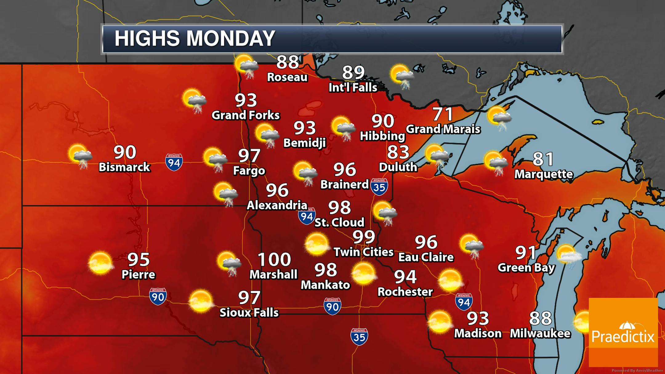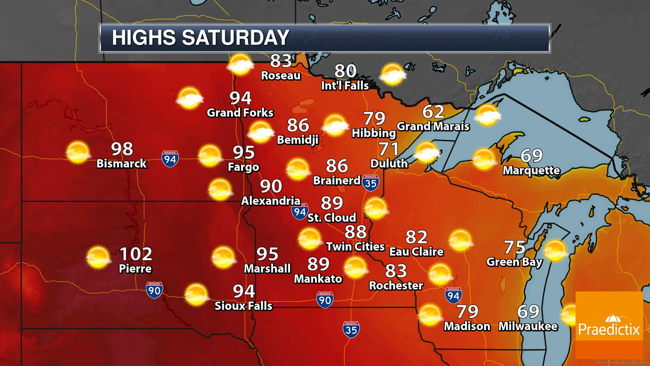 Here's a look at daily highs throughout this upcoming heat wave. The heat bubble will start to move into western Minnesota on Saturday with 90s expected, gradually moving east into Father's Day and early next week. For areas near the Minnesota/Dakota border, the warmest day of the stretch appears to be Father's Day Sunday, with the hottest temperatures (up near 100F) here in the metro Monday. While the heat will start to subside Tuesday, we could remain with highs in the 90s through Wednesday.